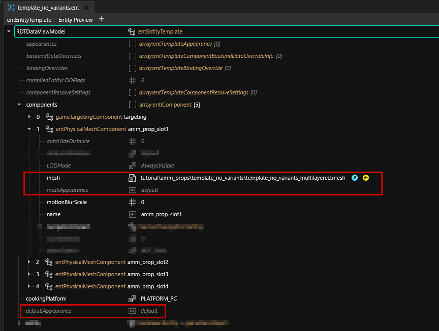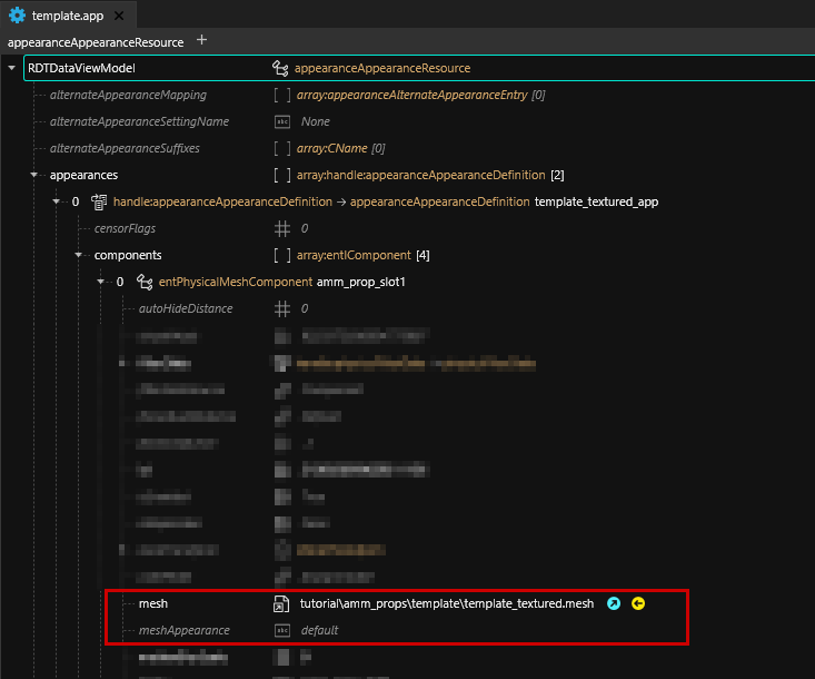 6. Finally, change the `defaultAppearance` to [a valid appearance in your .mesh file](https://github.com/CDPR-Modding-Documentation/Cyberpunk-Modding-Docs/blob/main/for-mod-creators/files-and-what-they-do/3d-objects-.mesh-files#step-1-appearances). If no appearance with this name can be found, the prop will be invisible when it spawns.