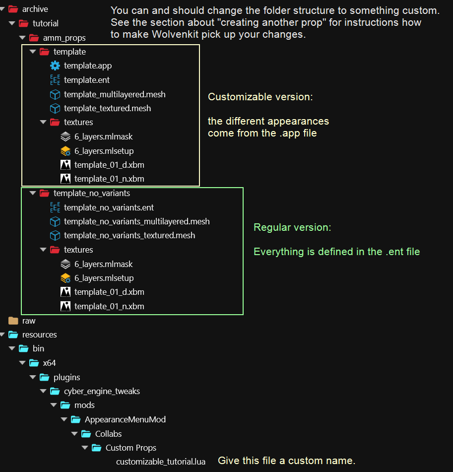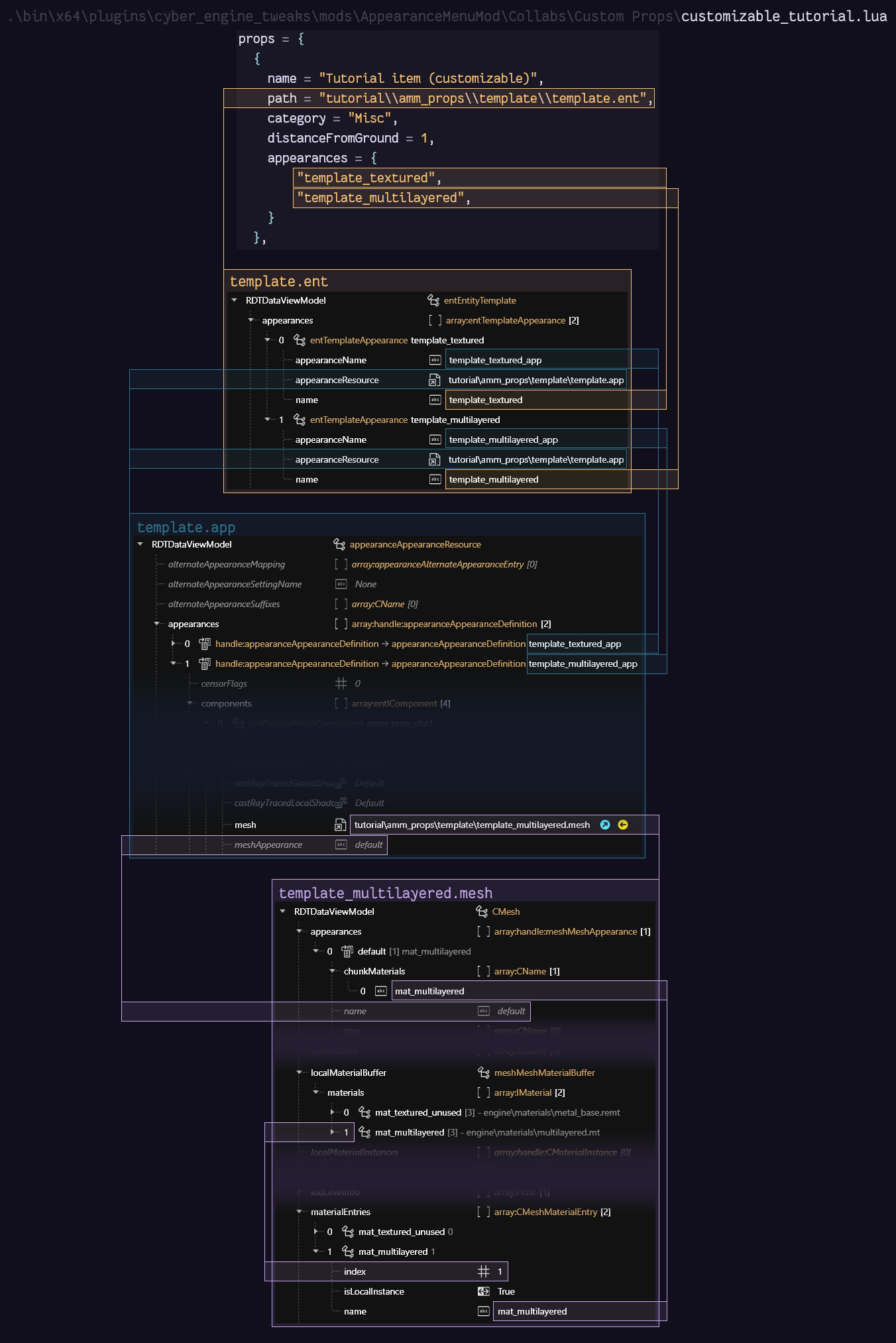 * customizable by chaining a [`root entity`](https://github.com/CDPR-Modding-Documentation/Cyberpunk-Modding-Docs/blob/main/for-mod-creators/files-and-what-they-do/entity-.ent-files#root-entity), an [`.app`](https://github.com/CDPR-Modding-Documentation/Cyberpunk-Modding-Docs/blob/main/for-mod-creators/files-and-what-they-do/appearance-.app-files), and a [`.mesh`](https://github.com/CDPR-Modding-Documentation/Cyberpunk-Modding-Docs/blob/main/for-mod-creators/files-and-what-they-do/3d-objects-.mesh-files) file with multiple appearances