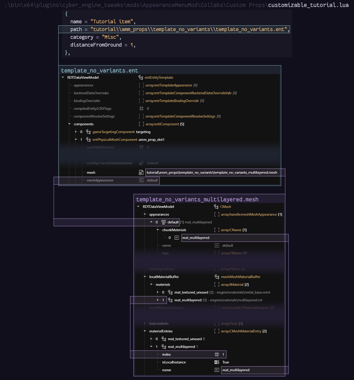 <figure><img src="https://1427525421-files.gitbook.io/~/files/v0/b/gitbook-x-prod.appspot.com/o/spaces%2F4gzcGtLrr90pVjAWVdTc%2Fuploads%2Fgit-blob-daa869ae05ad4a016891d8c519d5c3dbde811fd2%2Fcustom_props_change_mesh.png?alt=media" alt=""><figcaption><p>For props without appearances: <code>template_no_variants.ent</code></p></figcaption></figure>