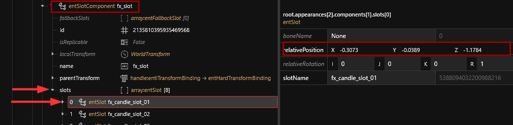 Now that you have the **relative position**, switch back to Wolvenkit: we need to add it to our `entSlotComponent`.