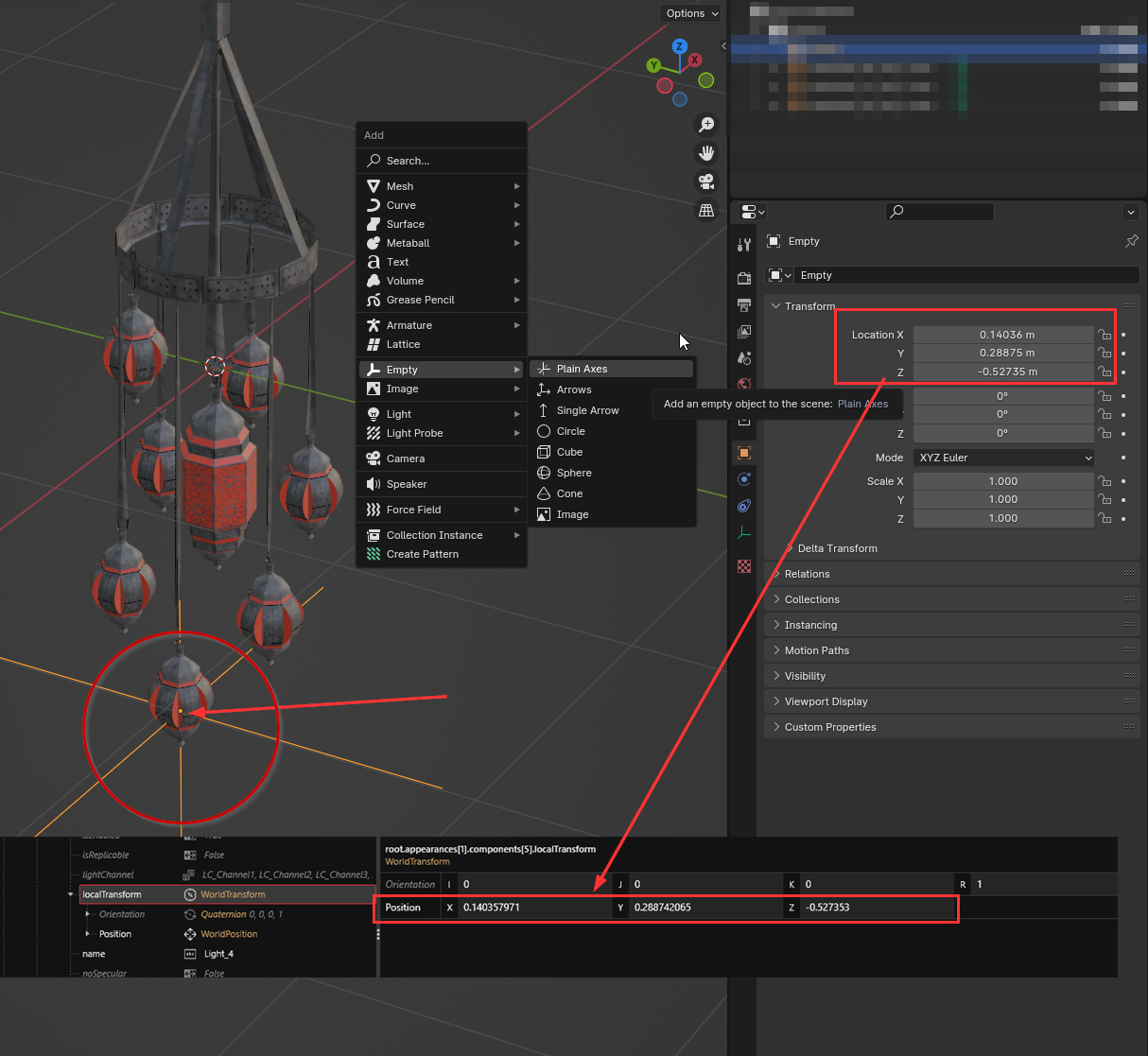 3. Copy the values from the "Transform" field in Blender (Screenshot above) to the corresponding fields under `relativePosition` (screenshot below)