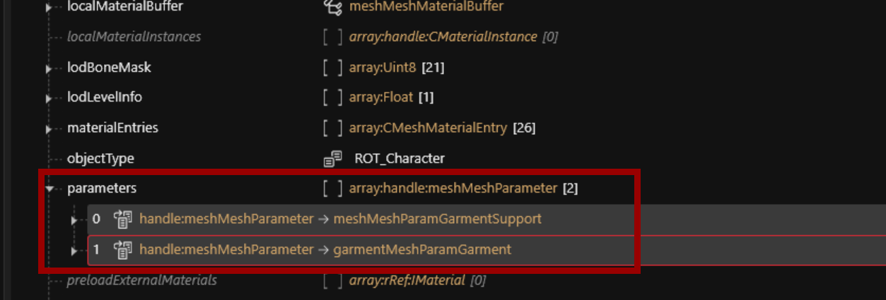 <figure><img src="https://1427525421-files.gitbook.io/~/files/v0/b/gitbook-x-prod.appspot.com/o/spaces%2F4gzcGtLrr90pVjAWVdTc%2Fuploads%2Fgit-blob-de53cd709db6c4c68a4041c5ffcaf6886b10848c%2Fgarment_support_broken.png?alt=media" alt=""><figcaption><p>Often, you can salvage things by deleting the parameters in WolvenKit</p></figcaption></figure>