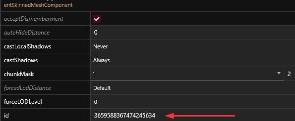 Check the component's **id** in the mesh `.ent` or `.app` appearance's `components` array: