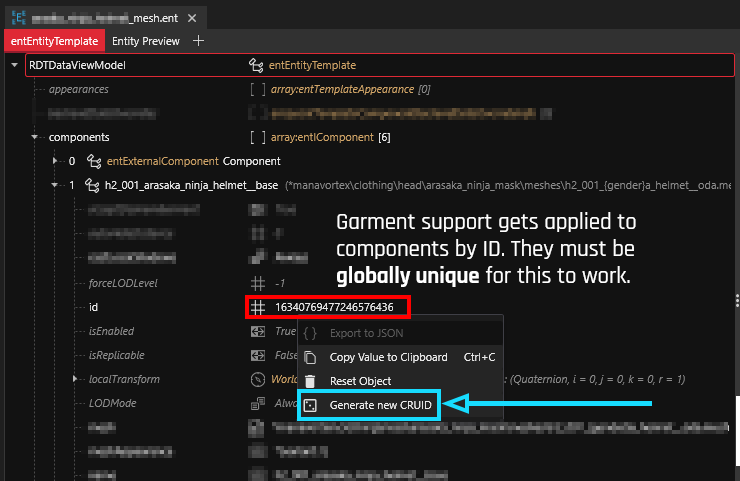<figure><img src="https://1427525421-files.gitbook.io/~/files/v0/b/gitbook-x-prod.appspot.com/o/spaces%2F4gzcGtLrr90pVjAWVdTc%2Fuploads%2Fgit-blob-da9a301105faff7c47486593c824c28888543a3e%2Funique_cruids.png?alt=media" alt=""><figcaption><p>The CRUID editor is available in Wolvenkit 8.14+ - you can go grab the <a href="https://github.com/WolvenKit/WolvenKit-nightly-releases/releases">Nightly</a>, too</p></figcaption></figure>