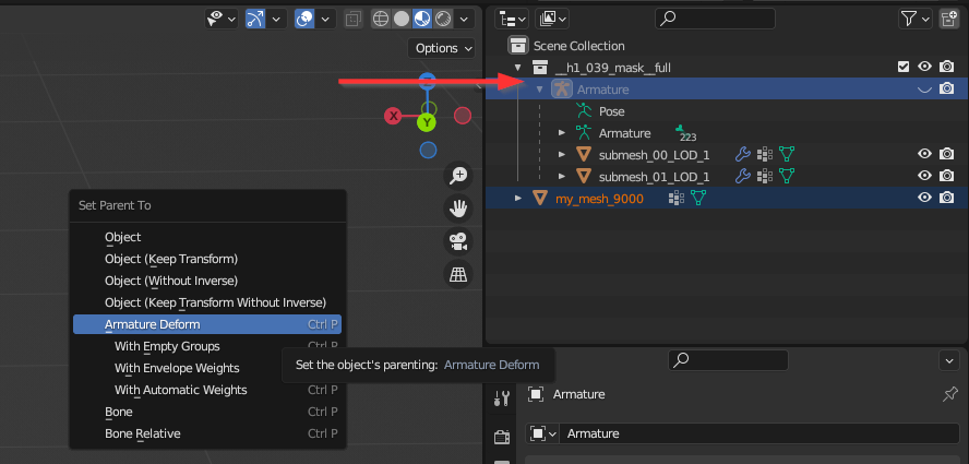 You now need to transfer the weights from your original game mesh. If you deleted or overwrote the armature's original meshes during [#step-3-parenting-the-mesh-es](#step-3-parenting-the-mesh-es "mention"), you can simply import it again for a second copy.