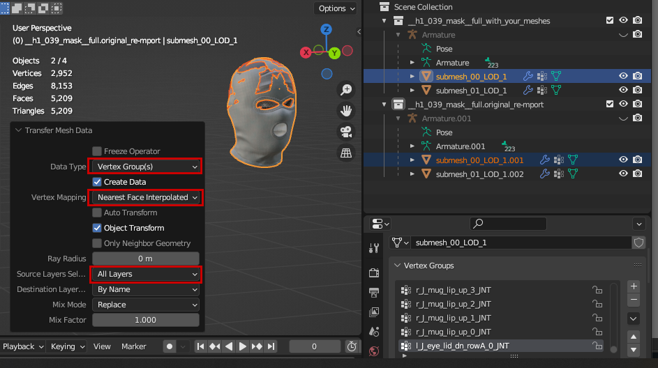 Start by **deleting all vertex groups** from your new mesh, as we will now replace these and don't want anything funky to stick around to destroy our re-import: