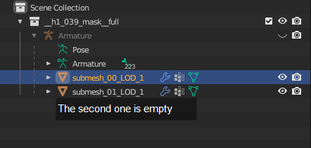 The **mesh count** in Blender corresponds to the [**submesh/chunk** ](https://wiki.redmodding.org/cyberpunk-2077-modding/for-mod-creators-theory/files-and-what-they-do/file-formats/3d-objects-.mesh-files/submeshes-materials-and-chunks)count in Wolvenkit. In Cyberpunk, we have one submesh per material that we want to use.