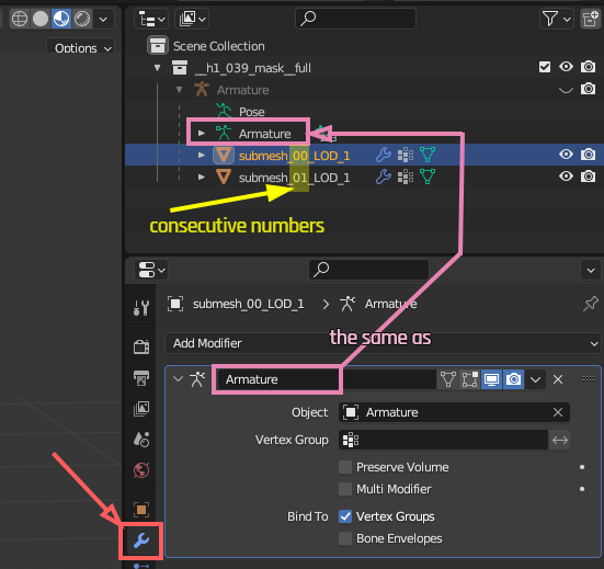 <figure><img src="https://1427525421-files.gitbook.io/~/files/v0/b/gitbook-x-prod.appspot.com/o/spaces%2F4gzcGtLrr90pVjAWVdTc%2Fuploads%2Fgit-blob-e11b51ed778dfe5d3d5644f7e836f68ad457c061%2Fporting_clothes_after_merge.png?alt=media" alt=""><figcaption><p>The new mesh should be from the Outliner and its data should be in one of the original meshes. If it's the other way around, <strong>Undo</strong> (Hotkey: <code>Ctrl+Z</code>) and select them in the right order. (You could've listened!)</p></figcaption></figure>