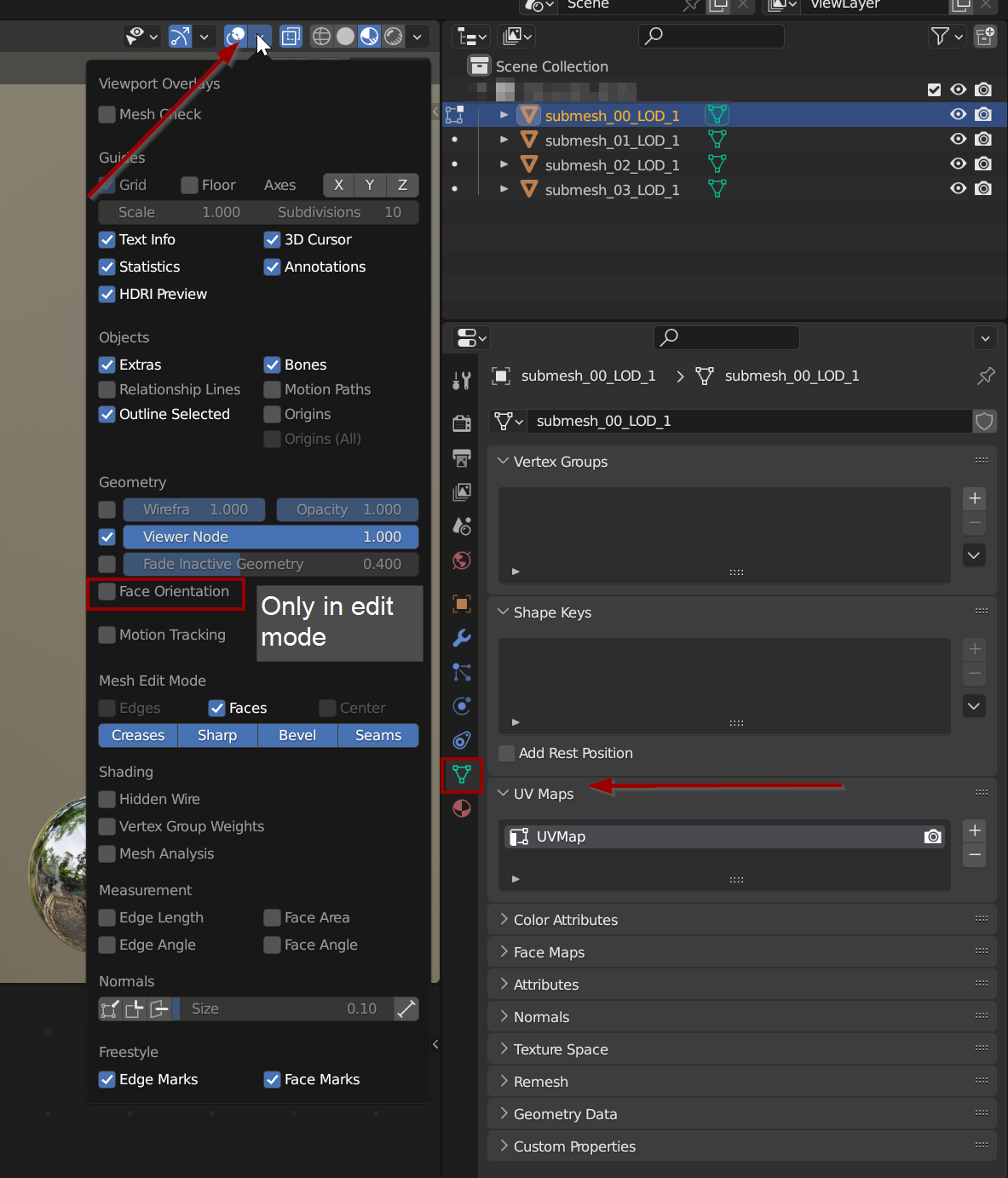 * check **Face Orientation** — most materials won't show backfaces (red). You can import submeshes with the suffix `_doubled` to make WolvenKit generate them for you, like it does with hair.