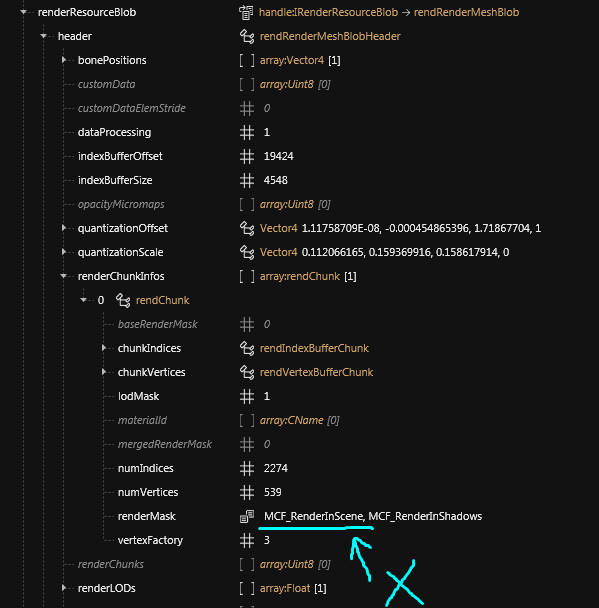 Check the `renderMask` attribute inside `renderResourceBlob / header / renderChunkInfos / index`*.* For shadow meshes, there shouldn't be anything but `MCF_RenderInShadows`.