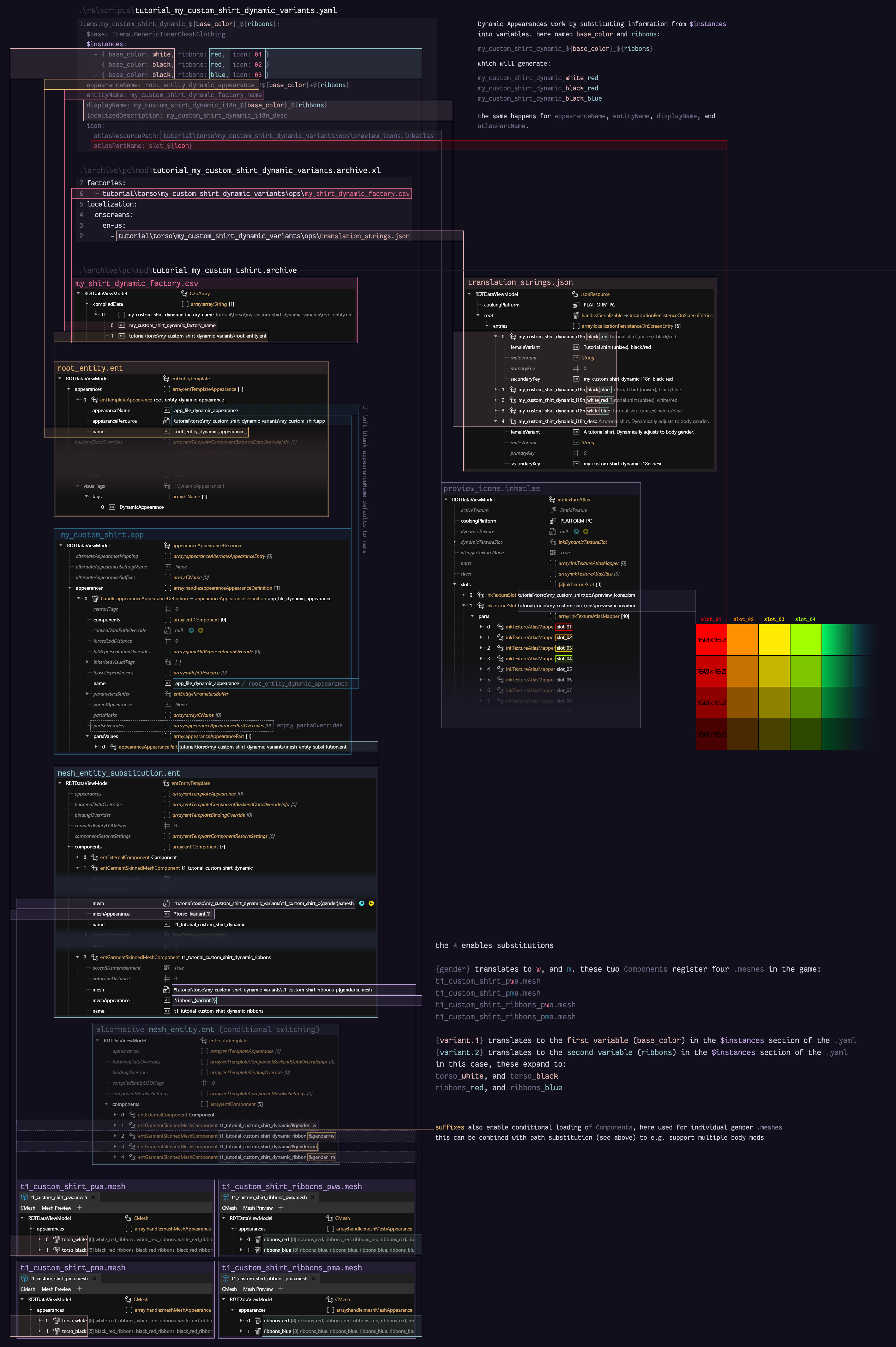 If you have ever tried to make ten colour variants of an item for two body genders with four different states of feet, then you're familiar with the struggle. Version 1.5.0 of ArchiveXL solves this problem by introducing dynamic variants, allowing you to define **rules** to hook up your yaml straight to the mesh entity. picking components and even appearances dynamically.
