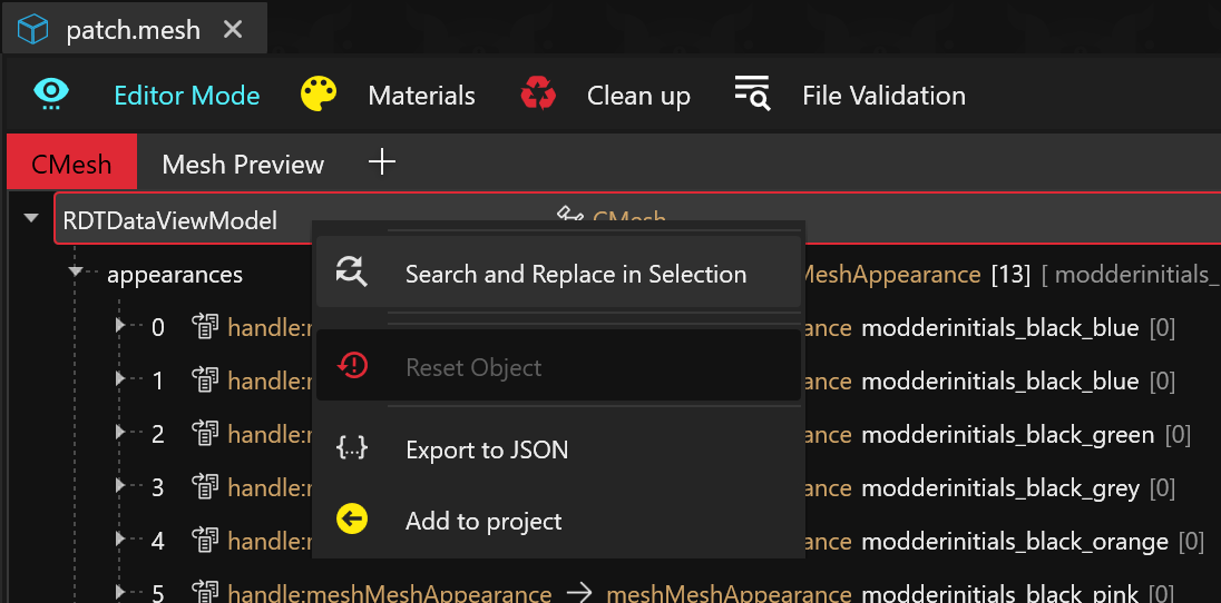 Next, open your patch.mesh and right click the RDTDataViewModel header.