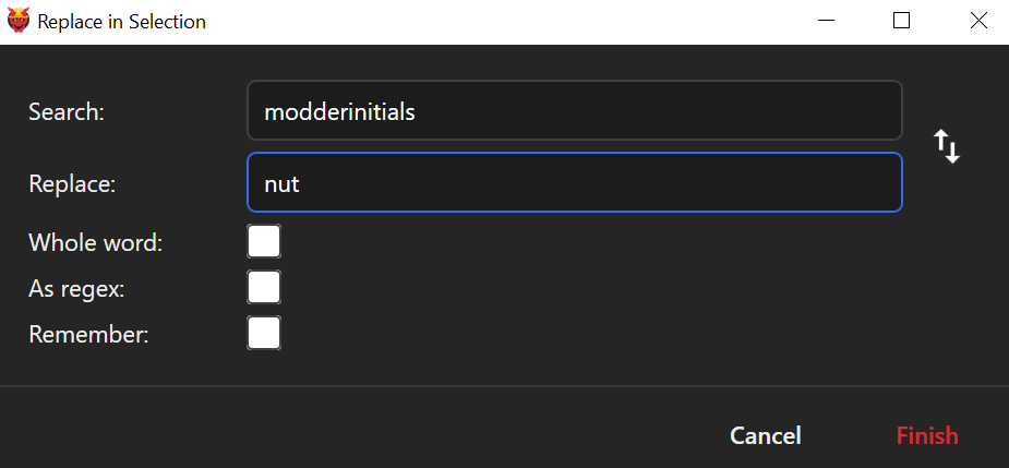Select "Search and Replace in selection" and set the search for "modderinitials" and the replacement to **your initials**. Click Finish.