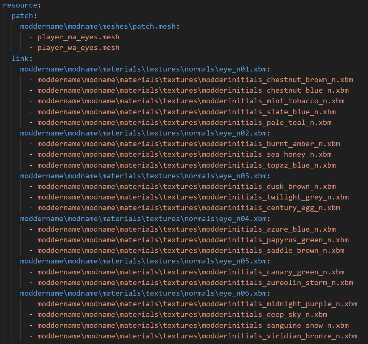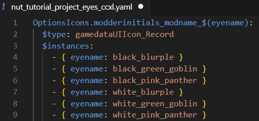 2. In the section under `$instances:`, edit or delete the placeholder names. After each "`eyename:`" add your own eyename. No need to include your modderinitials here, just the eyename.