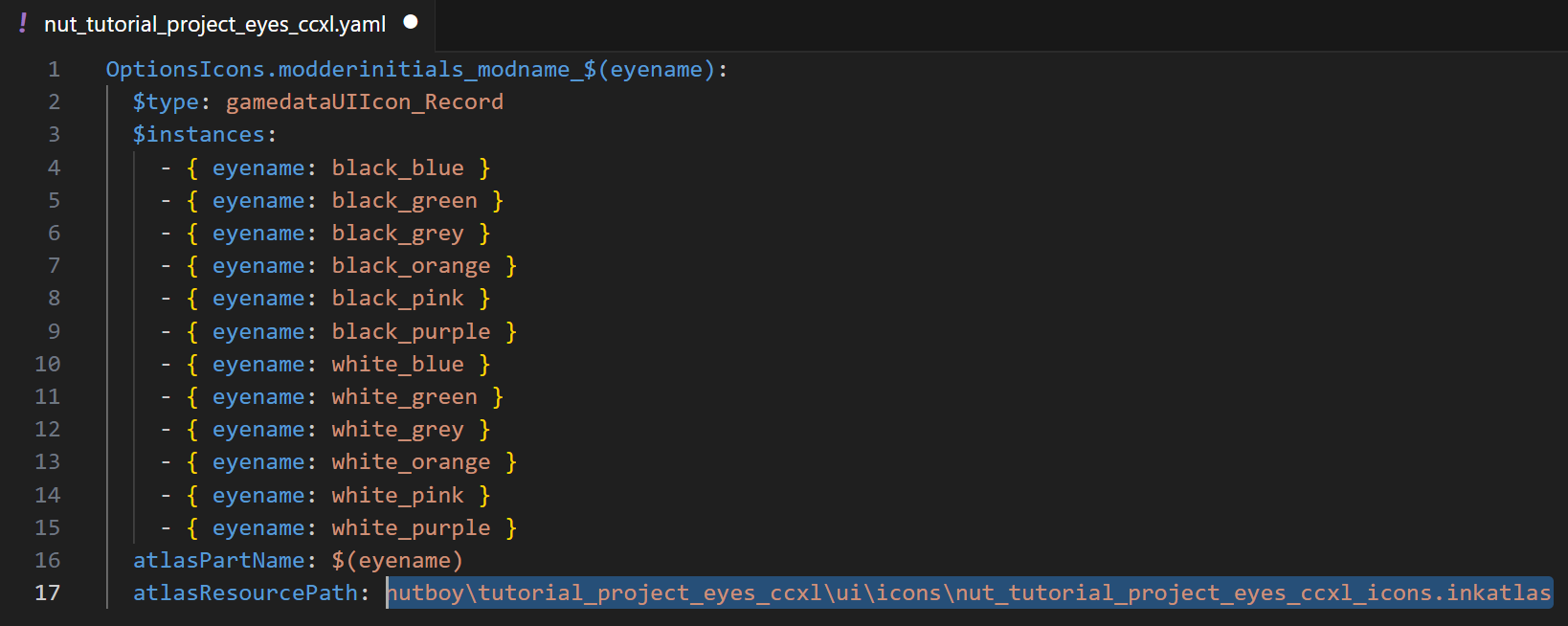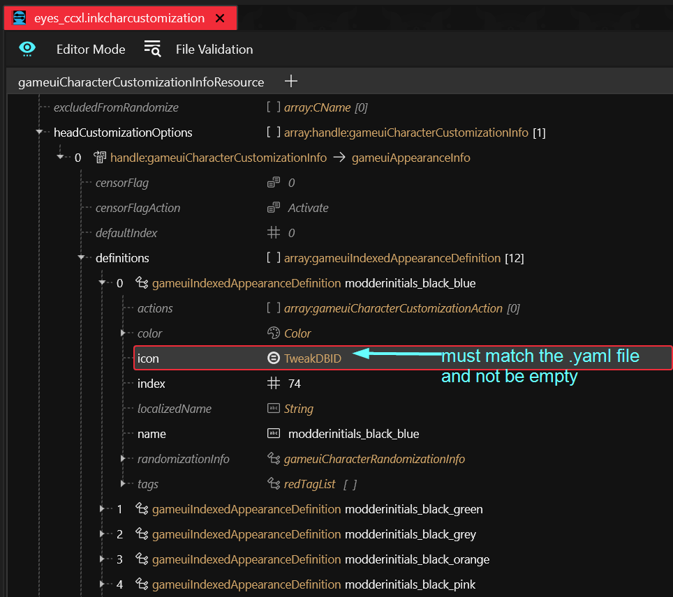 7. Click through each color in the definitions list, and update the `icon:` section, replacing `$(eyename)` with the corresponding color each time. Save your inkcharcustomization file.\\