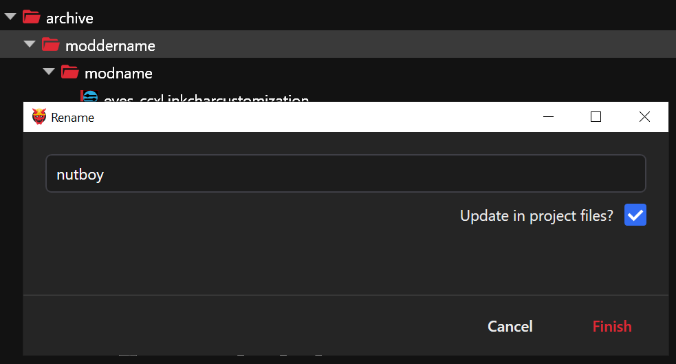 Next, rename the placeholder files in the **textures** folders by replacing `modderinitials` with your initials, with "Update in project files" checked.