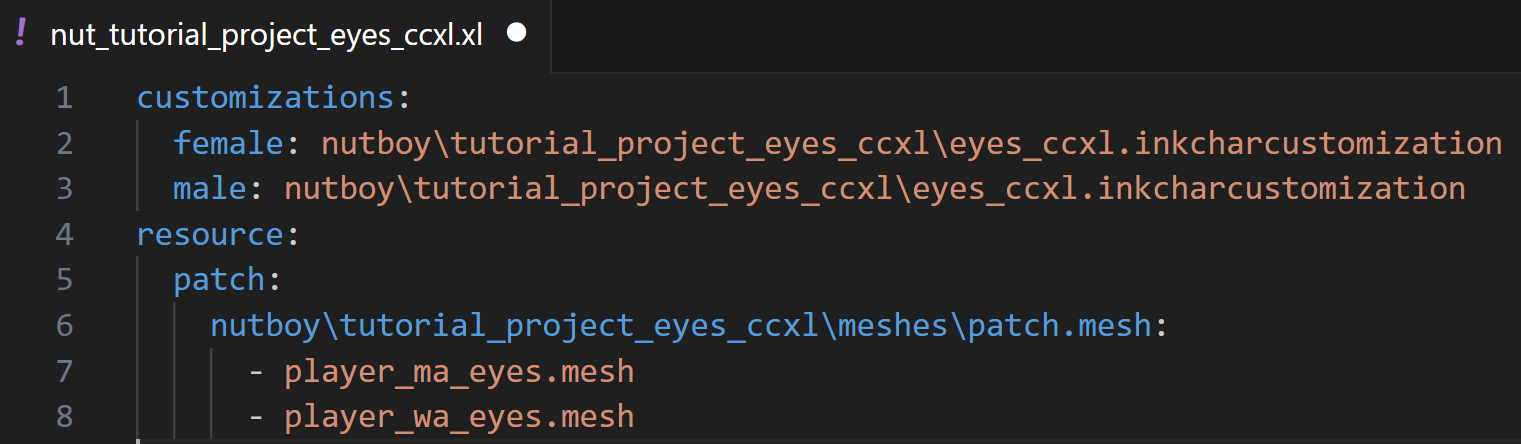 Next, copy the relative path to your `patch.mesh` from Wolvenkit, and replace the placeholder path on the line under `resource: patch:`