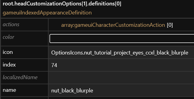 4. Expand `headCustomizationOptions`, then expand the first `gameuiAppearanceInfo`, and expand `definitions`
