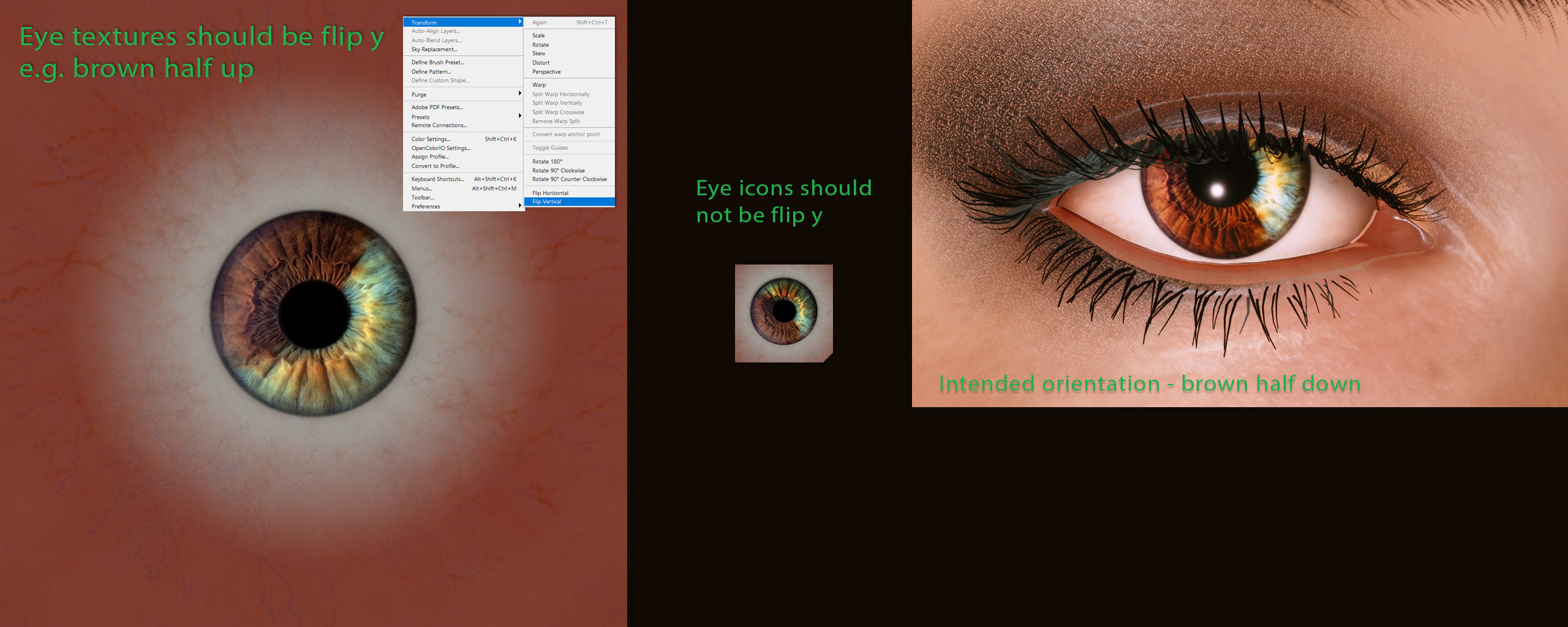 * Your albedo texture should be inverted y axis, but we want our icons to be the right way up, so we invert y again, `ctrl+a`, `ctrl+c` to copy to clipboard. Open `tutorial_icon_2k.psd` and `ctrl+v` to paste as new layer. Use the template layer as a guide for where the pupil should line up. When you are satisfied with placement, flatten all layers, scale the image to 160 x 160 pixels and `ctrl+a`, `ctrl+c` to copy to clipboard.