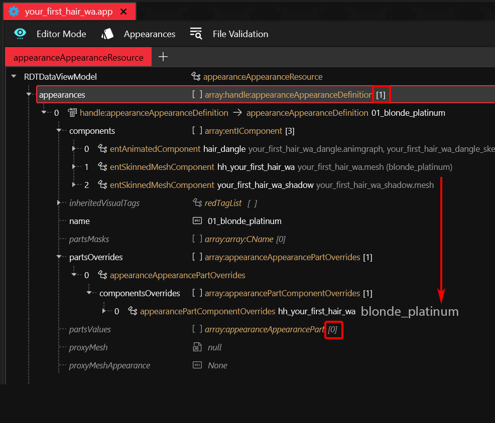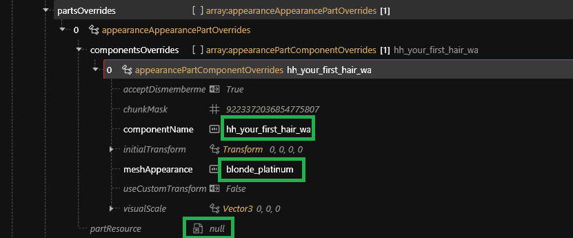 3. `partsOverrides` are not used by hairstyles in the basegame, but ArchiveXL does use them to generate/expand appearances in .app and to unambiguously resolve `meshAppearance` per component per `appearanceAppearanceDefinition`.