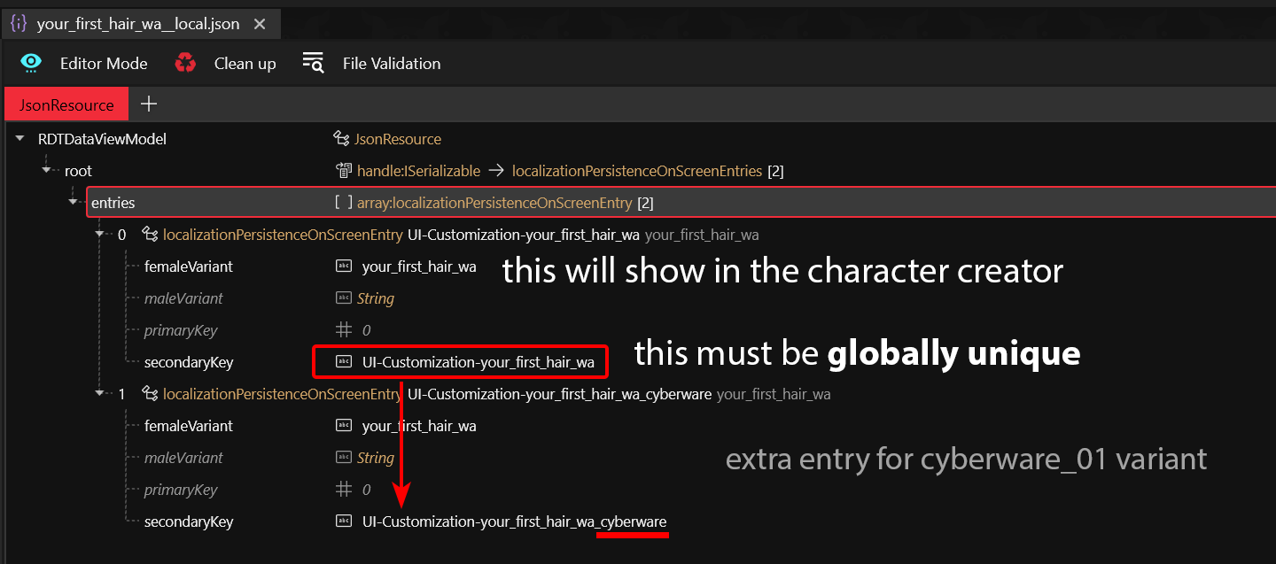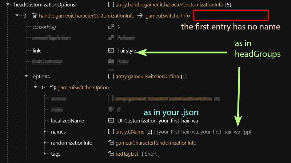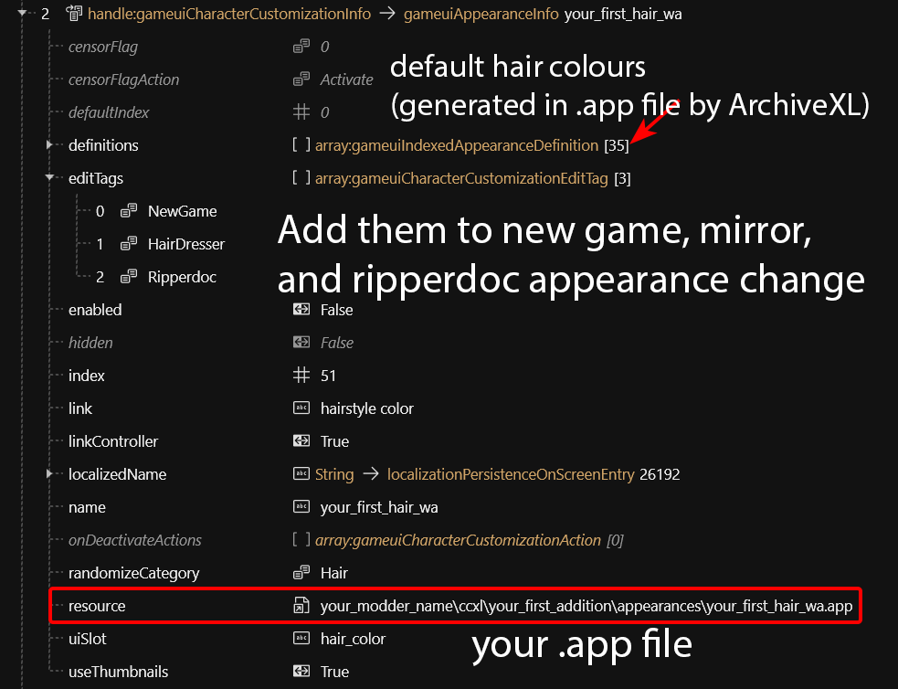 <table><thead><tr><th width="187">key</th><th width="238.5">value</th><th>explanation</th></tr></thead><tbody><tr><td><code>femaleVariant</code></td><td><code>Your First Hair</code></td><td></td></tr><tr><td><code>maleVariant</code></td><td><em>leave it blank</em></td><td>If no value is found, then <code>femaleVariant</code> acts as default</td></tr><tr><td><code>primaryKey</code></td><td>0</td><td>Will be generated by ArchiveXL, leave it alone</td></tr><tr><td><code>secondaryKey</code></td><td><code>UI-Customization-your_first_hair</code></td><td>Used in the <code>.inkcharactercustomization</code> file to set your hair's entry name</td></tr></tbody></table>