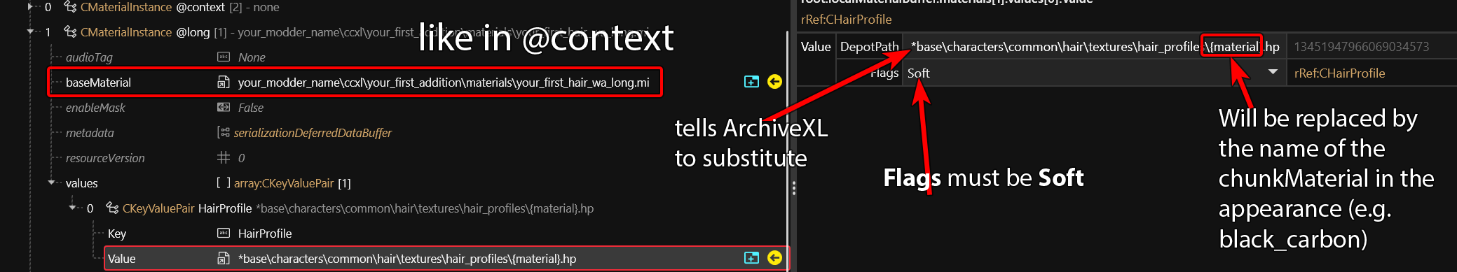 * If you wish to change basegame materials (e.g. path to custom hair textures), then your @context string will be a path to one of the external material instance ( `.mi` ) files in the project.