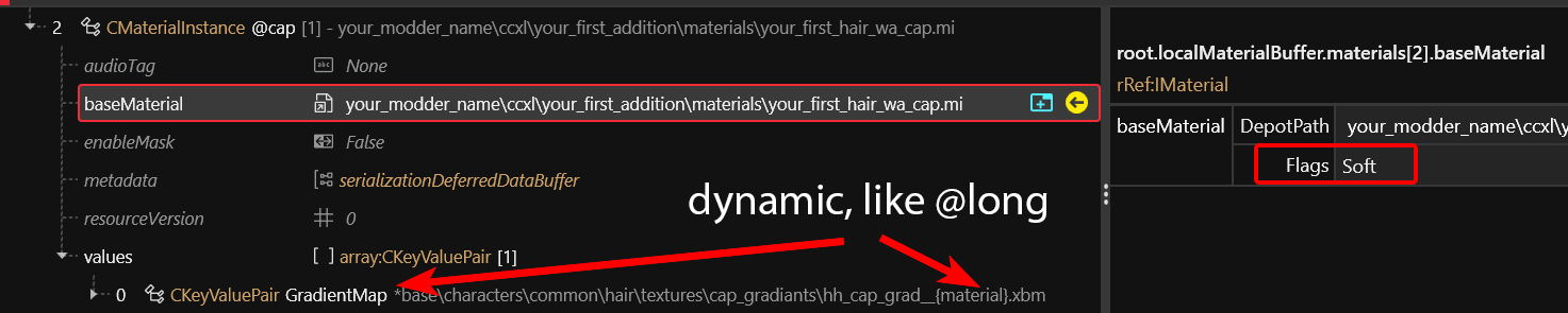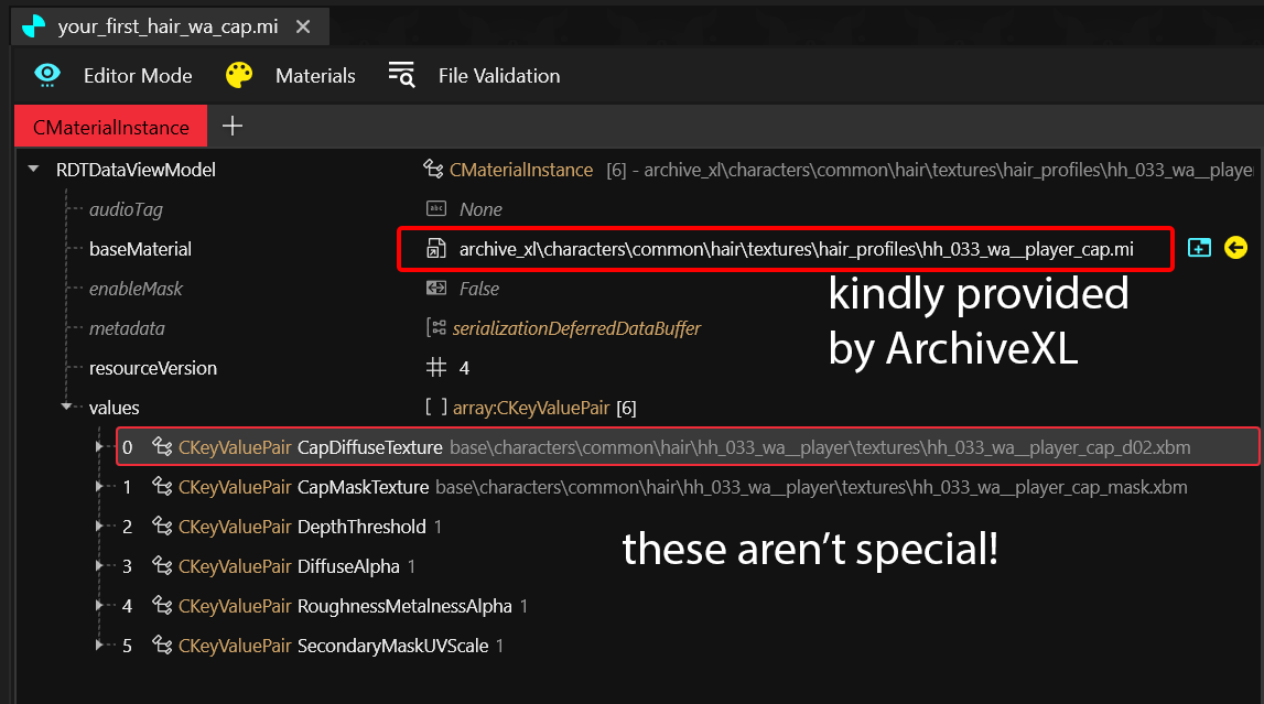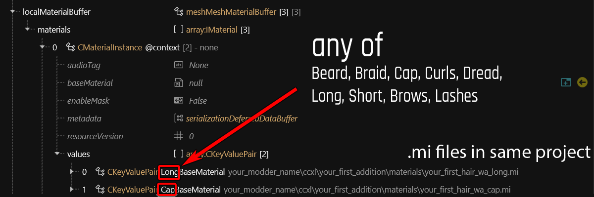 With the exception of the hair cap, the .mi file is a completely normal [material template file](https://wiki.redmodding.org/cyberpunk-2077-modding/for-mod-creators-theory/files-and-what-they-do/file-formats/materials/re-using-materials-.mi) (link not necessary for understanding this guide).
