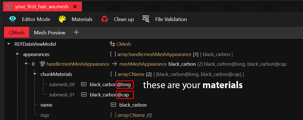 To understand material definitions, you can check [https://github.com/CDPR-Modding-Documentation/Cyberpunk-Modding-Docs/blob/main/for-mod-creators-theory/files-and-what-they-do/file-formats/3d-objects-.mesh-files](https://github.com/CDPR-Modding-Documentation/Cyberpunk-Modding-Docs/blob/main/for-mod-creators-theory/files-and-what-they-do/file-formats/3d-objects-.mesh-files "mention") -> [https://github.com/CDPR-Modding-Documentation/Cyberpunk-Modding-Docs/blob/main/for-mod-creators-theory/files-and-what-they-do/file-formats/3d-objects-.mesh-files#step-2-material-registry](https://github.com/CDPR-Modding-Documentation/Cyberpunk-Modding-Docs/blob/main/for-mod-creators-theory/files-and-what-they-do/file-formats/3d-objects-.mesh-files#step-2-material-registry "mention"). This is not necessary to complete the guide, though!