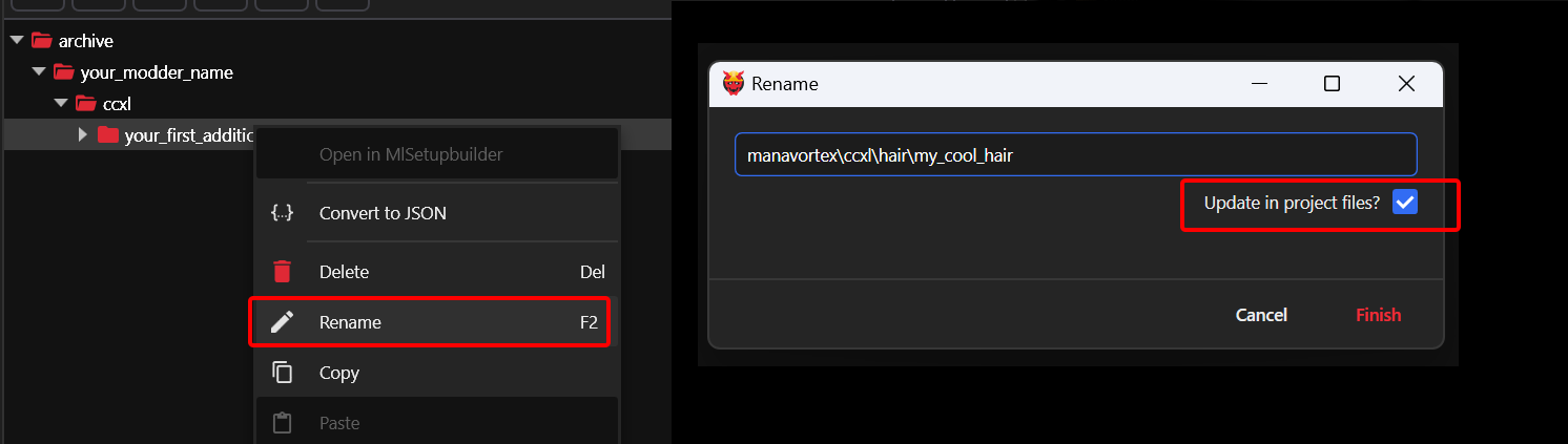 3. Move any `.mesh`, `.animgraph`, and `.rig` files from your original hair to `your_modder_name\ccxl\your_first_addition\meshes`