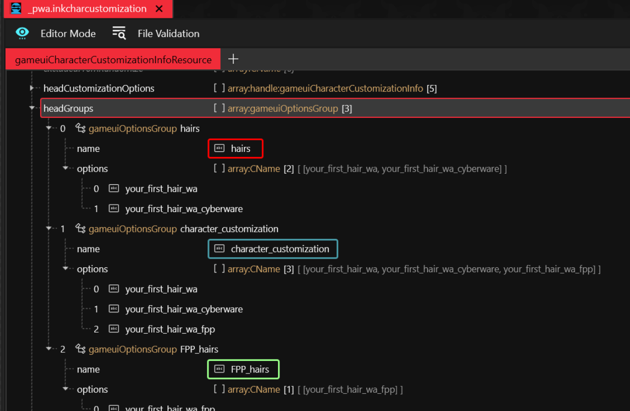 Let's take a look at the `headCustomizationOptions`. The first to entries of the type `gameuiSwitcherInfo` add our new hair to Cyberpunk's character creator menu, so that they show up when you scroll through the hairs.
