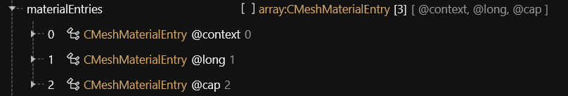 In our example, the first submesh uses the material `@long`, and the second one the material `@cap`.