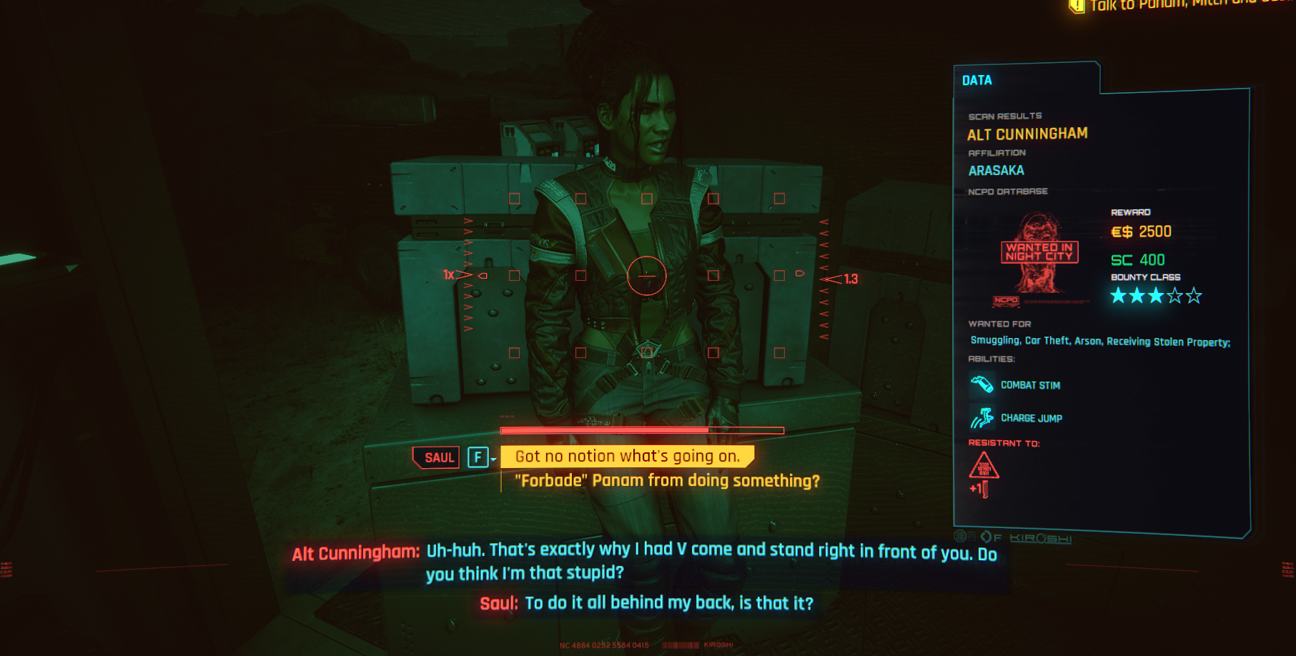 <figure><img src="https://1427525421-files.gitbook.io/~/files/v0/b/gitbook-x-prod.appspot.com/o/spaces%2F4gzcGtLrr90pVjAWVdTc%2Fuploads%2Fgit-blob-efb4ff545da99584f6e7274feb43e2b3f97d4910%2FScreenshot_2.png?alt=media" alt=""><figcaption><p>Panam works for Arasaka now.</p></figcaption></figure>