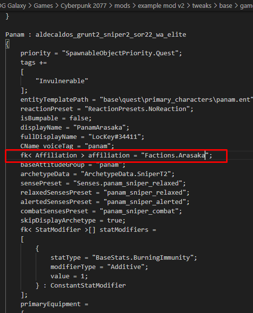 <table><thead><tr><th width="212.33333333333331">property name</th><th>value in Panam's template</th><th>explanation</th></tr></thead><tbody><tr><td><code>fullDisplayName</code></td><td><a href="https://app.gitbook.com/s/-MP_ozZVx2gRZUPXkd4r/wolvenkit-app/editor/lockey-browser">LocKey#34413</a></td><td>Which text is displayed in scan tab?</td></tr><tr><td>displayName</td><td><a href="https://app.gitbook.com/s/-MP_ozZVx2gRZUPXkd4r/wolvenkit-app/editor/lockey-browser">LocKey#34412</a></td><td>Which text is displayed in dialogues and choices?</td></tr><tr><td>archetypeData</td><td><code>ArchetypeData.SniperT2</code></td><td>base template (how she fights)</td></tr></tbody></table>