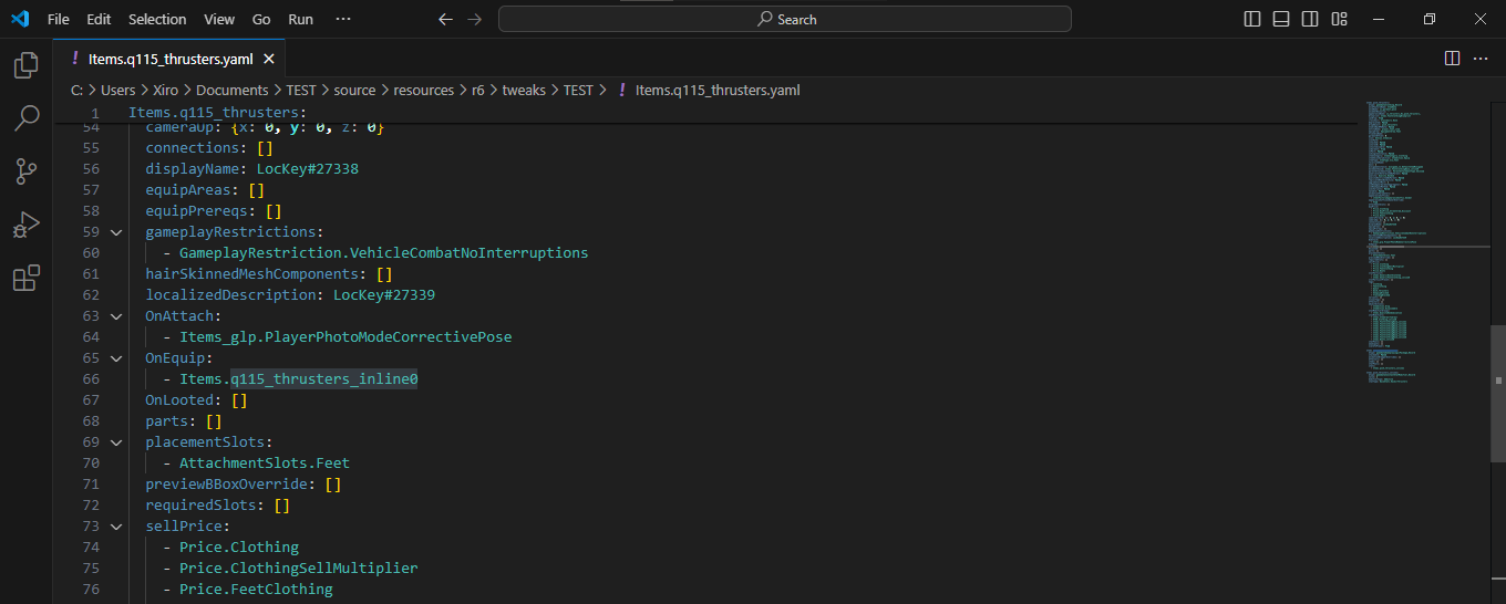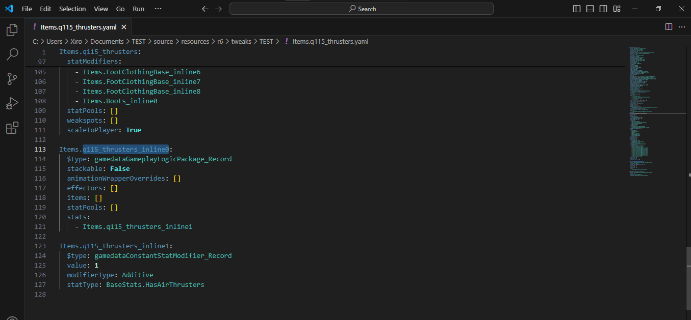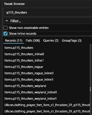 Internally, that item is called `q115_thrusters`. Now that we know that, we can search the item in **Wolvenkit Tweak Broswe**r.
