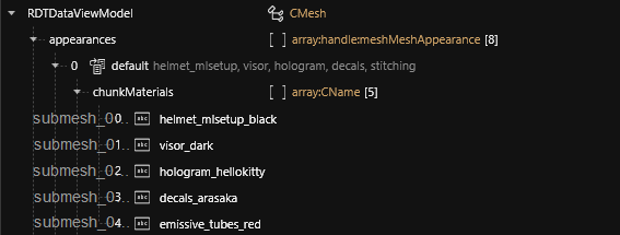 Our fictional helmet appearance uses the materials `helmet_mlsetup_black`, `visor_dark`, `hologram_hellokitty`, `decals_arasaka` and `emissive_tubes_red`. There are at least three more materials / variants defined for every possible slot, but the default appearance is a black helmet with red lights, Arasaka decals, and a Hello Kitty face projected on its black visor. Or in short: major-league professional tactical gear.