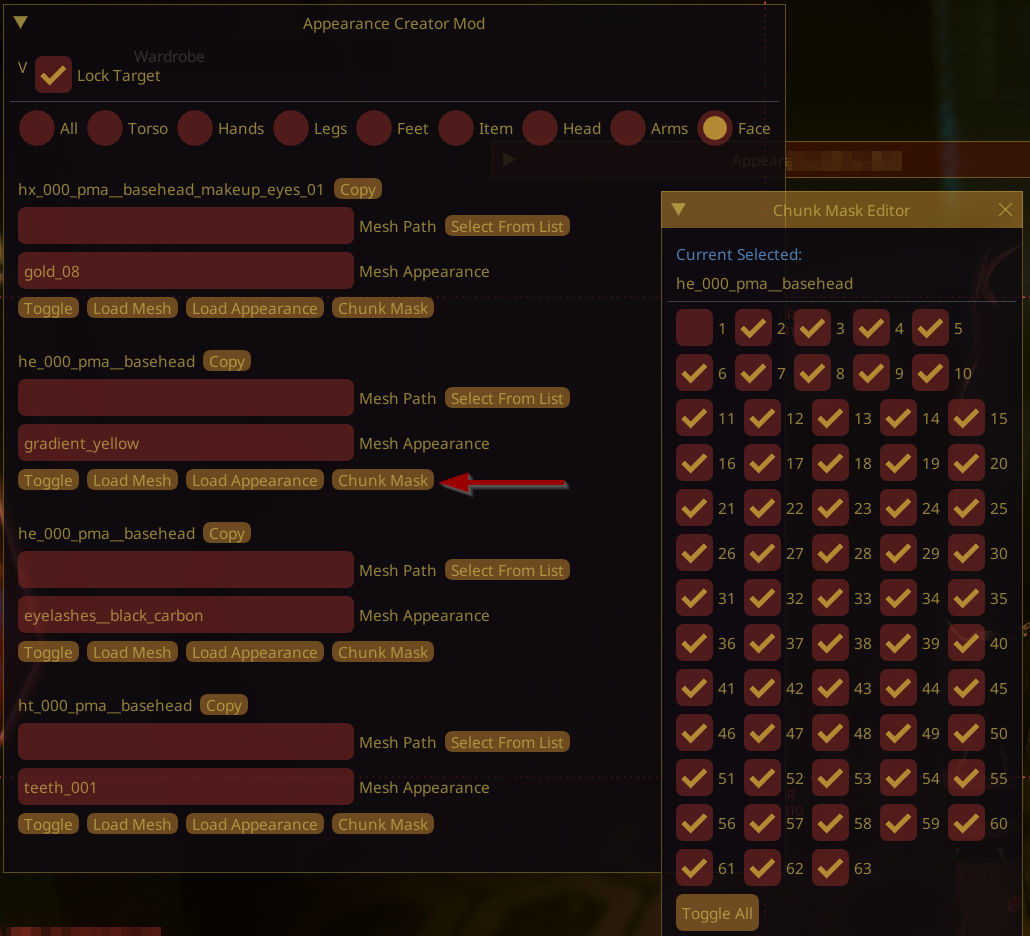 <figure><img src="https://1427525421-files.gitbook.io/~/files/v0/b/gitbook-x-prod.appspot.com/o/spaces%2F4gzcGtLrr90pVjAWVdTc%2Fuploads%2Fgit-blob-3f837b3c1291454b8df1ad41100cd5632a2c0975%2Fappearance_creator_mod.png?alt=media" alt=""><figcaption><p>Finding a component's chunkmask with Appearance Creator Mod</p></figcaption></figure>