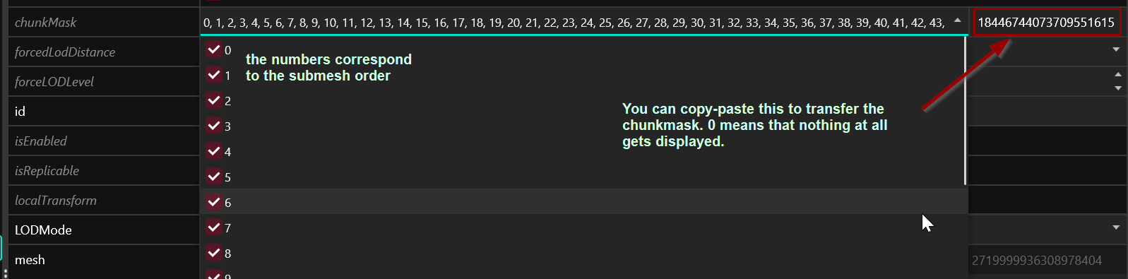 <figure><img src="https://1427525421-files.gitbook.io/~/files/v0/b/gitbook-x-prod.appspot.com/o/spaces%2F4gzcGtLrr90pVjAWVdTc%2Fuploads%2Fgit-blob-4174e5247723d854b2a3f7ae2ed69ee6665f99ed%2Fchunkmask.png?alt=media" alt=""><figcaption><p>Set this to 0 to completely hide all parts of a mesh.</p></figcaption></figure>