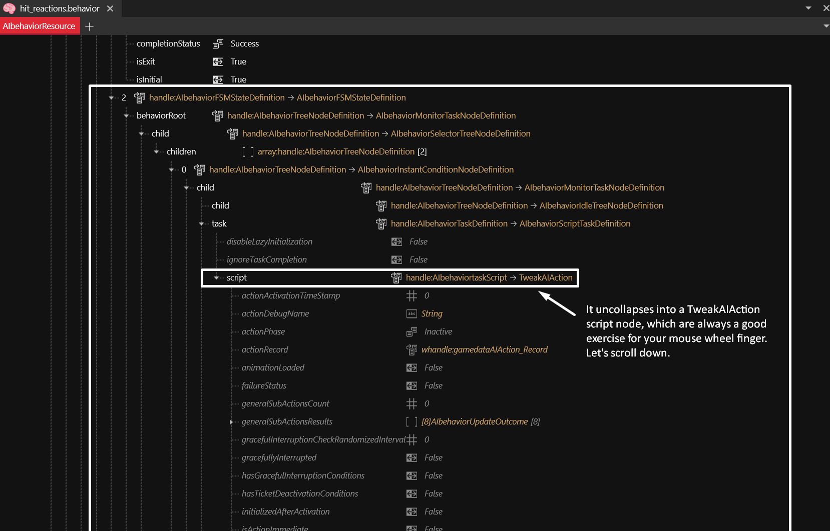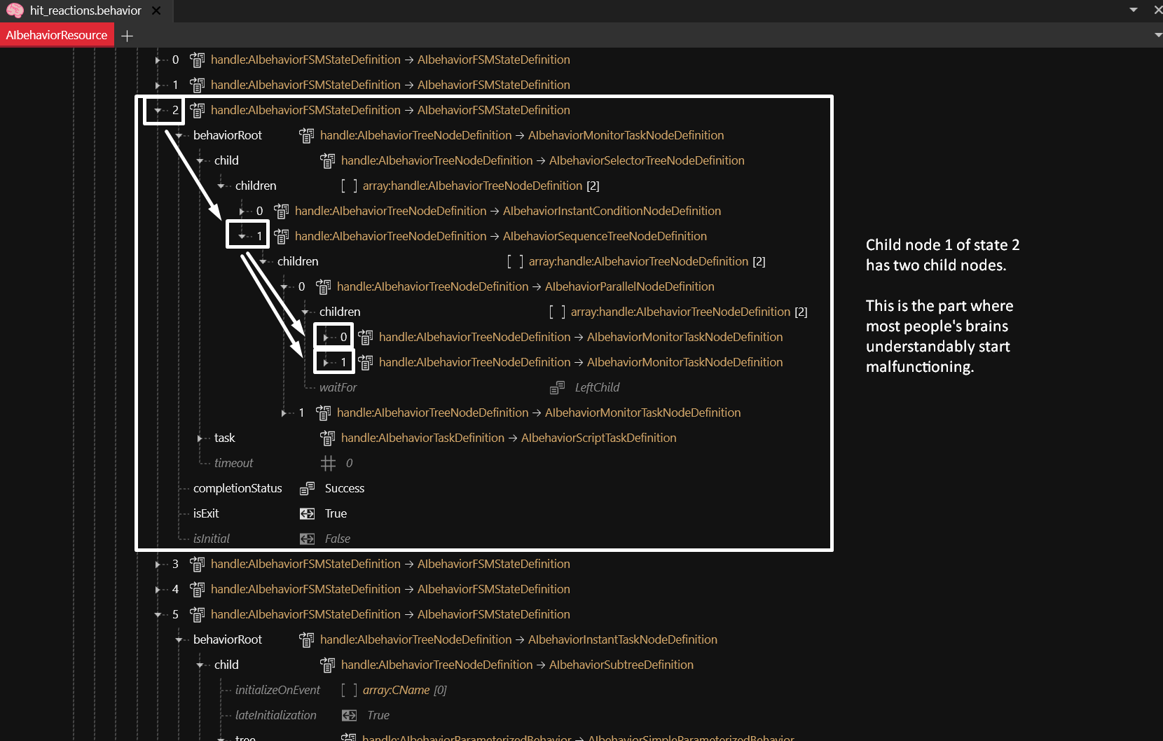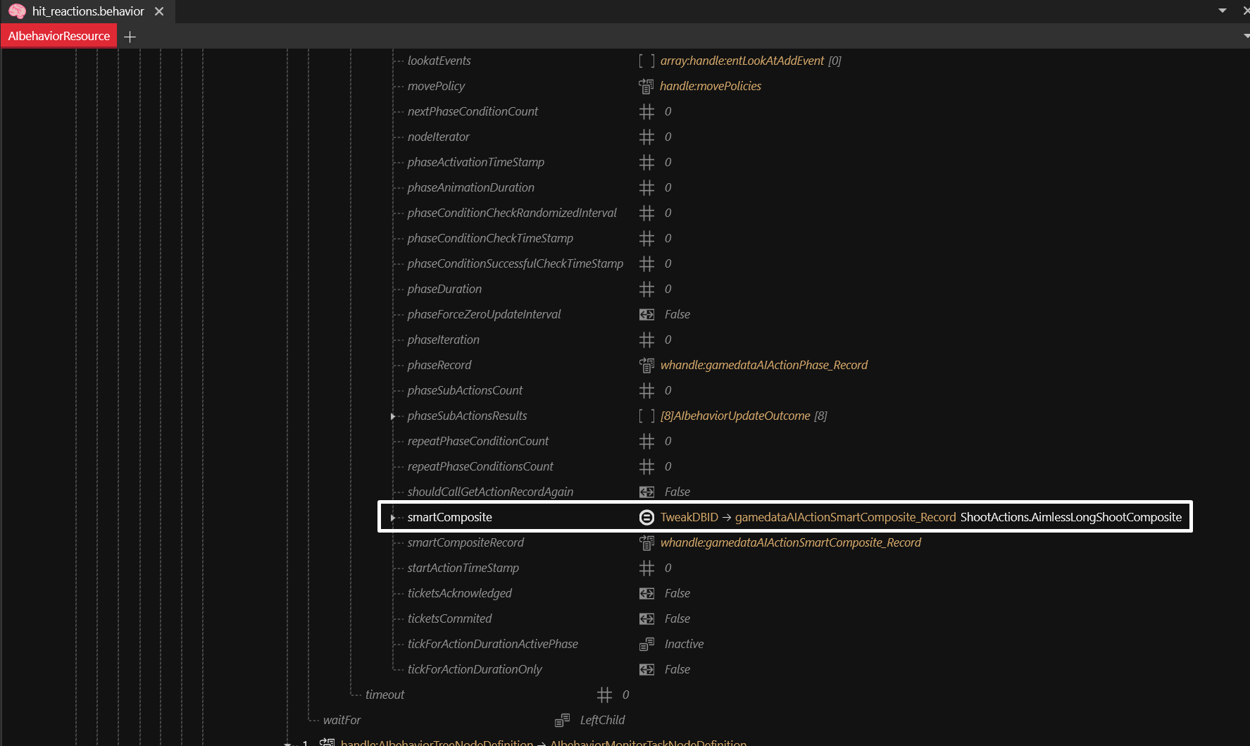 **Behavior files** are node graphs (currently browsable only in list form) responsible for determining A.I. responses to various stimuli based on specific conditions. For instance, the **hit\_reaction.behavior** file works in tandem with other files to establish how NPCs react to certain kinds of hits, and determines which NPC types are excluded from which behaviors.