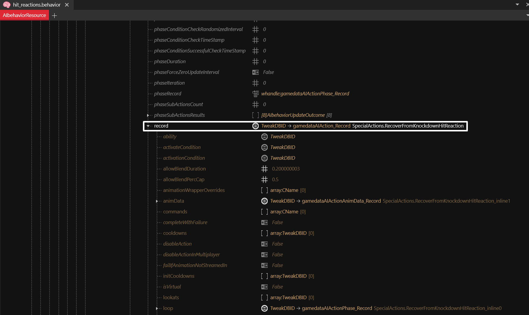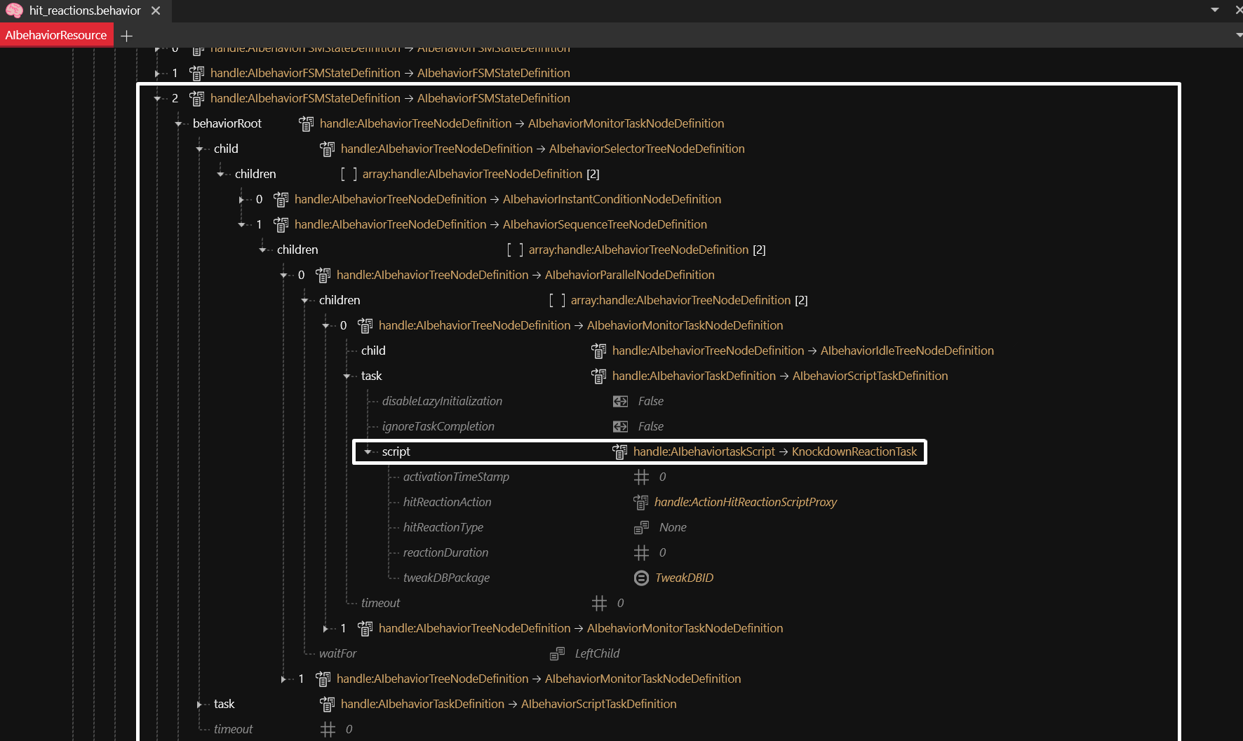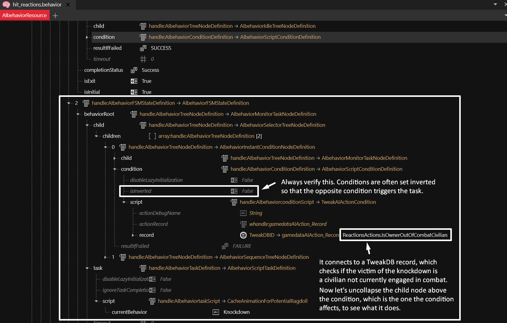 It is important to note that .behavior files do not exist in isolation; the hit reaction system, for instance, is reliant on multiple files and functions. This synergy has to be taken into consideration when editing or replacing nodes in .behavior files, and the conditions established in these nodes or in the TweakDB records they use must be verified. They may, for example, exclude bosses from certain behaviors, so deleting those nodes can cause considerable issues.