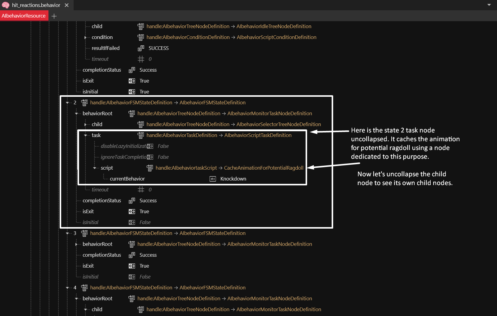 This goes down quite a few layers. The task node is what happens in that particular layer, and the child nodes take you into the deeper layers. In this case, the knockdown animation is being cached for potential ragdoll. Here's what that looks like: