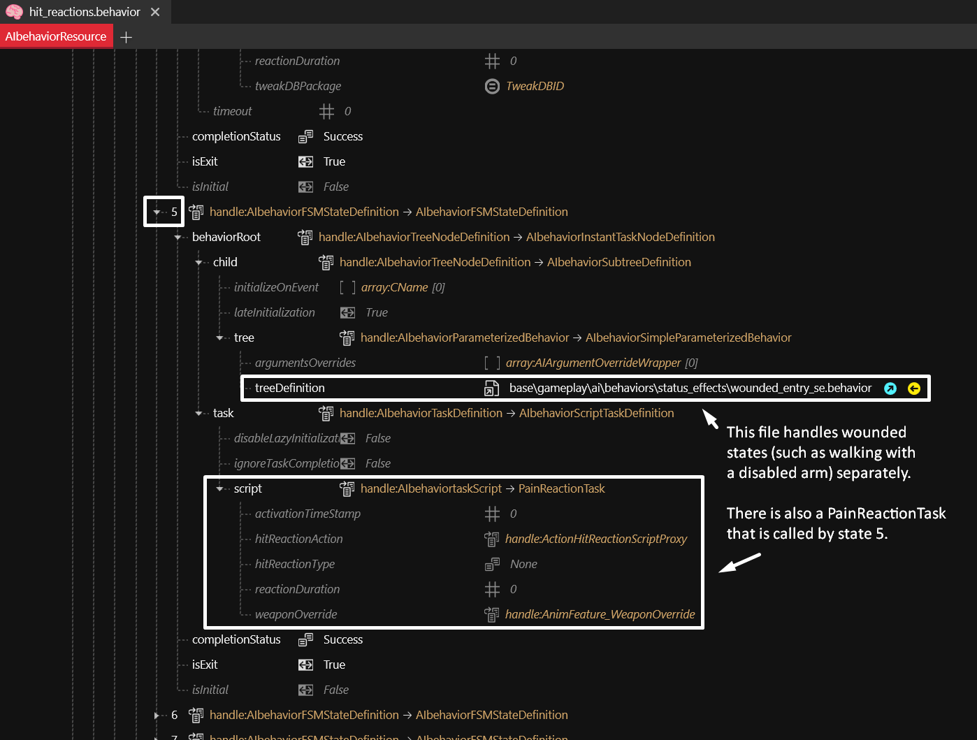 The .behavior files can also point to different .behavior files. Here we see state 5 of **hit\_reactions.behavior** referencing **wounded\_entry\_se.behavior**, which details some of the wounded actions such as walking with an injured arm. State 5 also calls the PainReactionTask script: