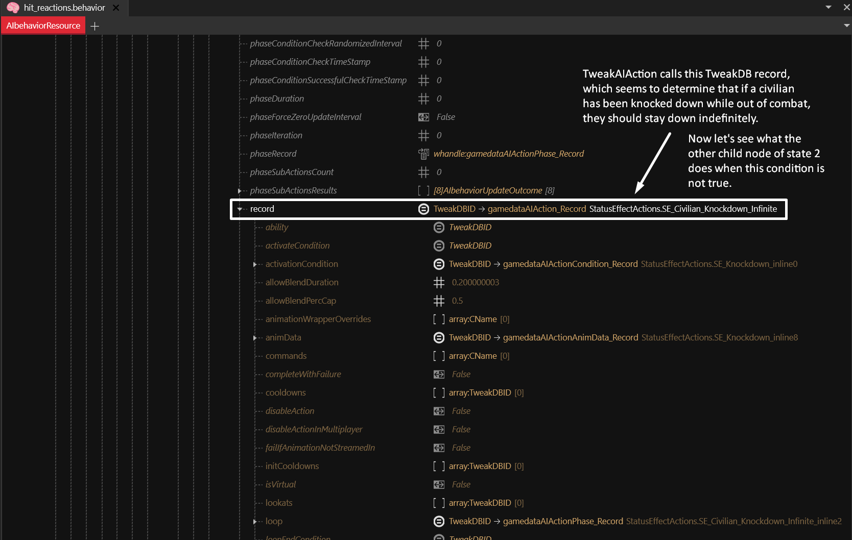 This particular condition calls a TweakAIActionCondition node, which connects to a TweakDB record. The record being used checks if the victim of the knockdown is a civilian not currently engaged in combat. Remember that conditions may be set *inverted*, so that the opposite condition is what triggers the task. TweakDB records may also contain their own conditions inside them, inverted or uninverted, so it's good to uncollapse them and take a look.