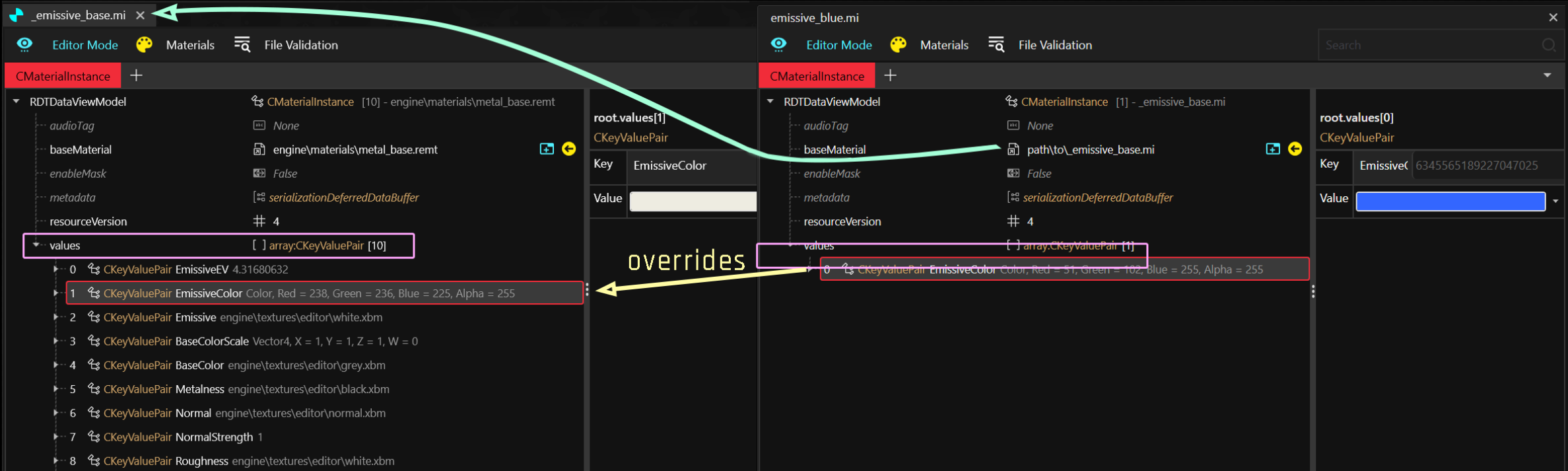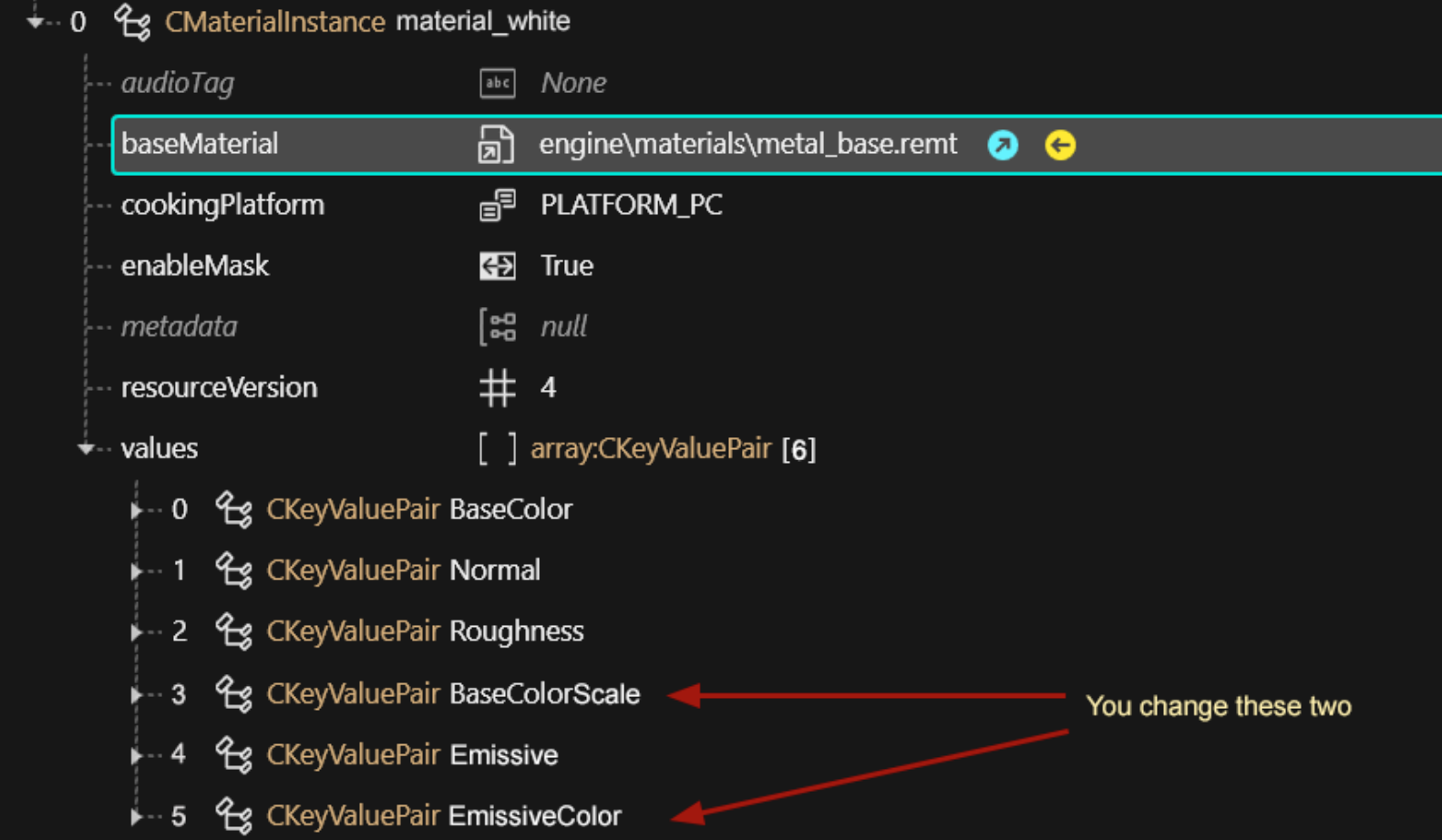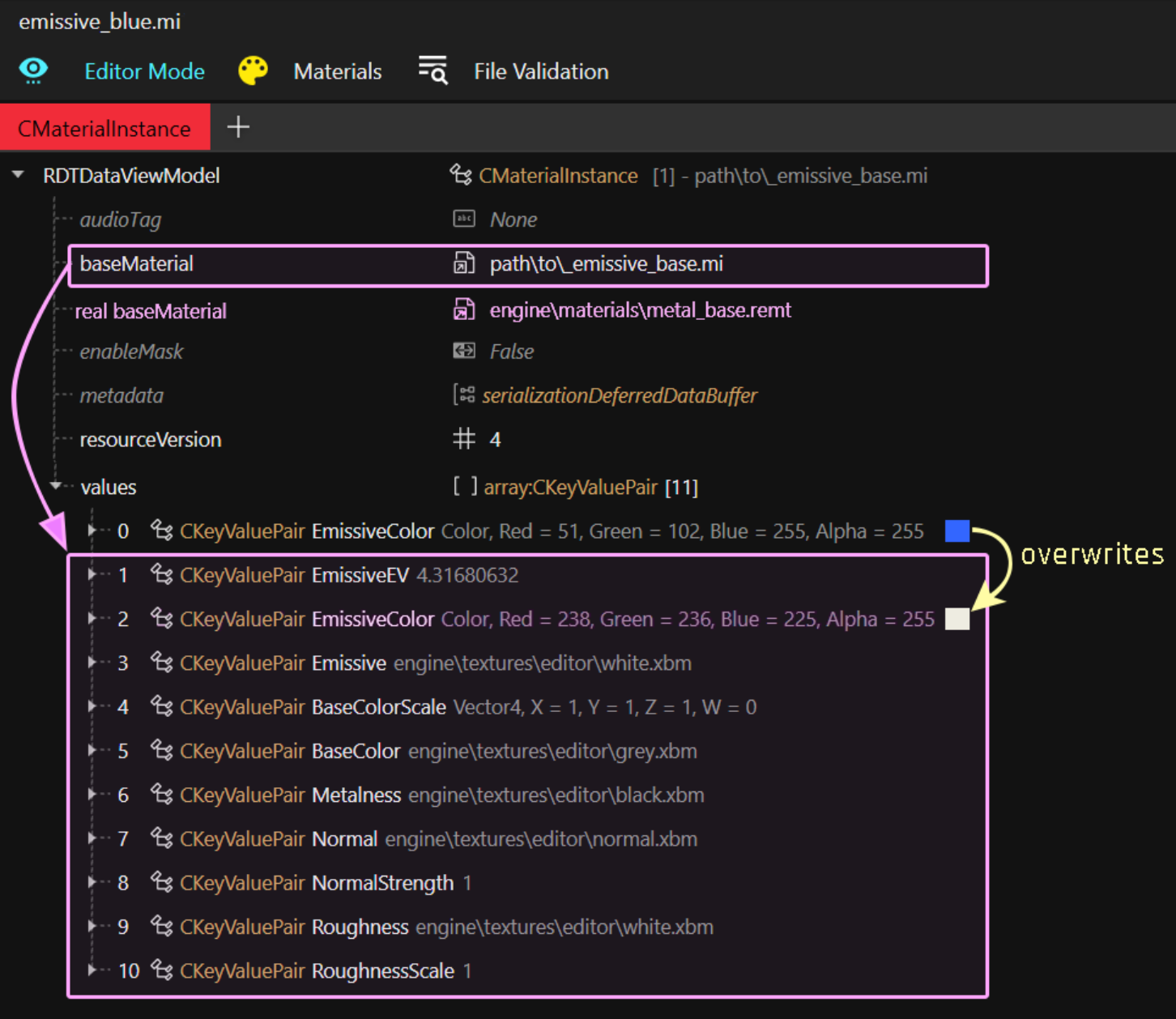 <figure><img src="https://1427525421-files.gitbook.io/~/files/v0/b/gitbook-x-prod.appspot.com/o/spaces%2F4gzcGtLrr90pVjAWVdTc%2Fuploads%2Fgit-blob-9d629712ddc1f7af3e7b271c2eca463c36dfd21b%2Femissive_template_expanded.png?alt=media" alt=""><figcaption><p>... and everything else that's <a href="../../../../materials/configuring-materials#checking-material-properties">defined inside</a> metal_base.remt</p></figcaption></figure>