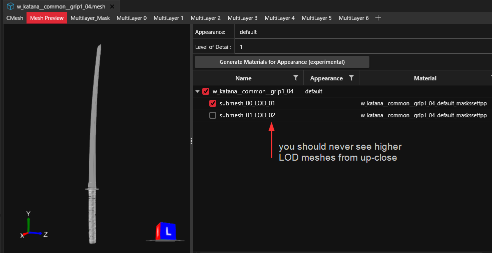 You can see submeshes and their LODs in the [Mesh Preview](https://app.gitbook.com/s/-MP_ozZVx2gRZUPXkd4r/wolvenkit-app/editor/file-editor/preview#mesh-preview):