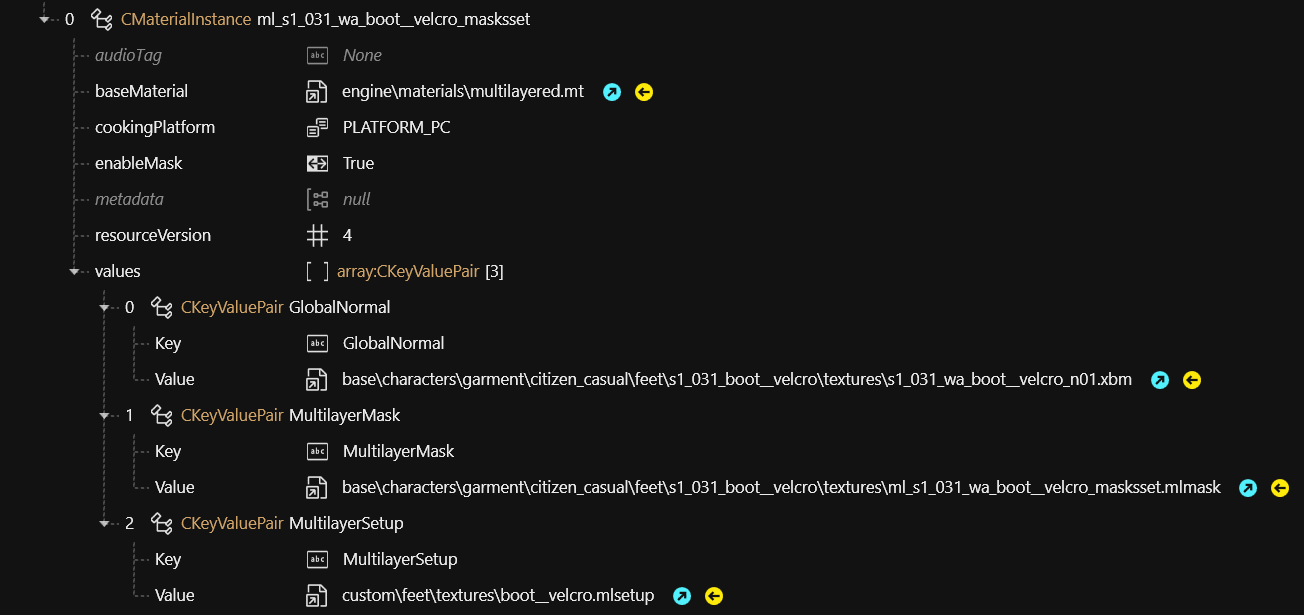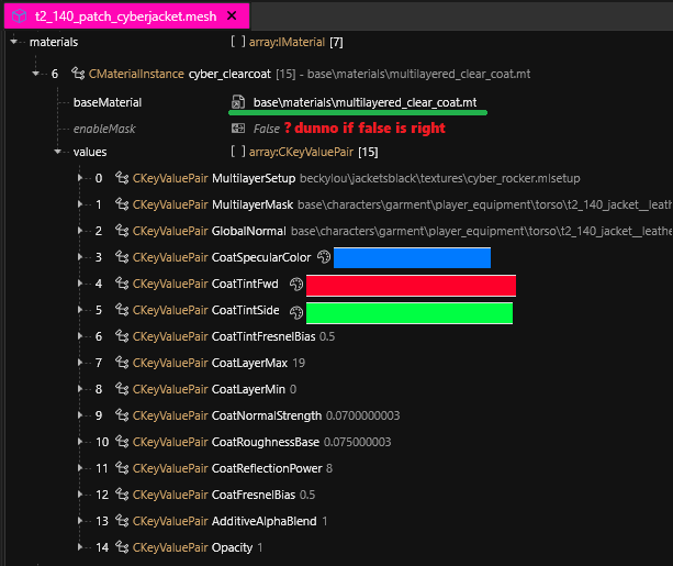| MultilayerMask  | path\to\mask.mlmask ([white file](https://wiki.redmodding.org/cyberpunk-2077-modding/references-lists-and-overviews/cheat-sheet-materials#white-multilayermask)) |