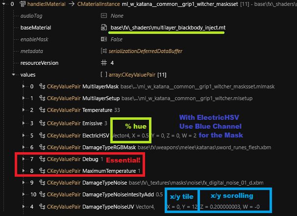 Putting multilayerblackbody\_inject.mt into debugging mode allows for the addition of emissives on top of your multilayer setup. The simplest example of this is on the DLC magic rune katana.