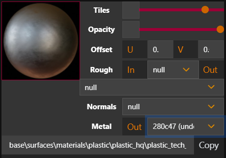 Material Composer will also display all the material parameters that comes with the material template (materials baked by the CDPR system have their parameters hidden if they were left as default before the baking of the release).