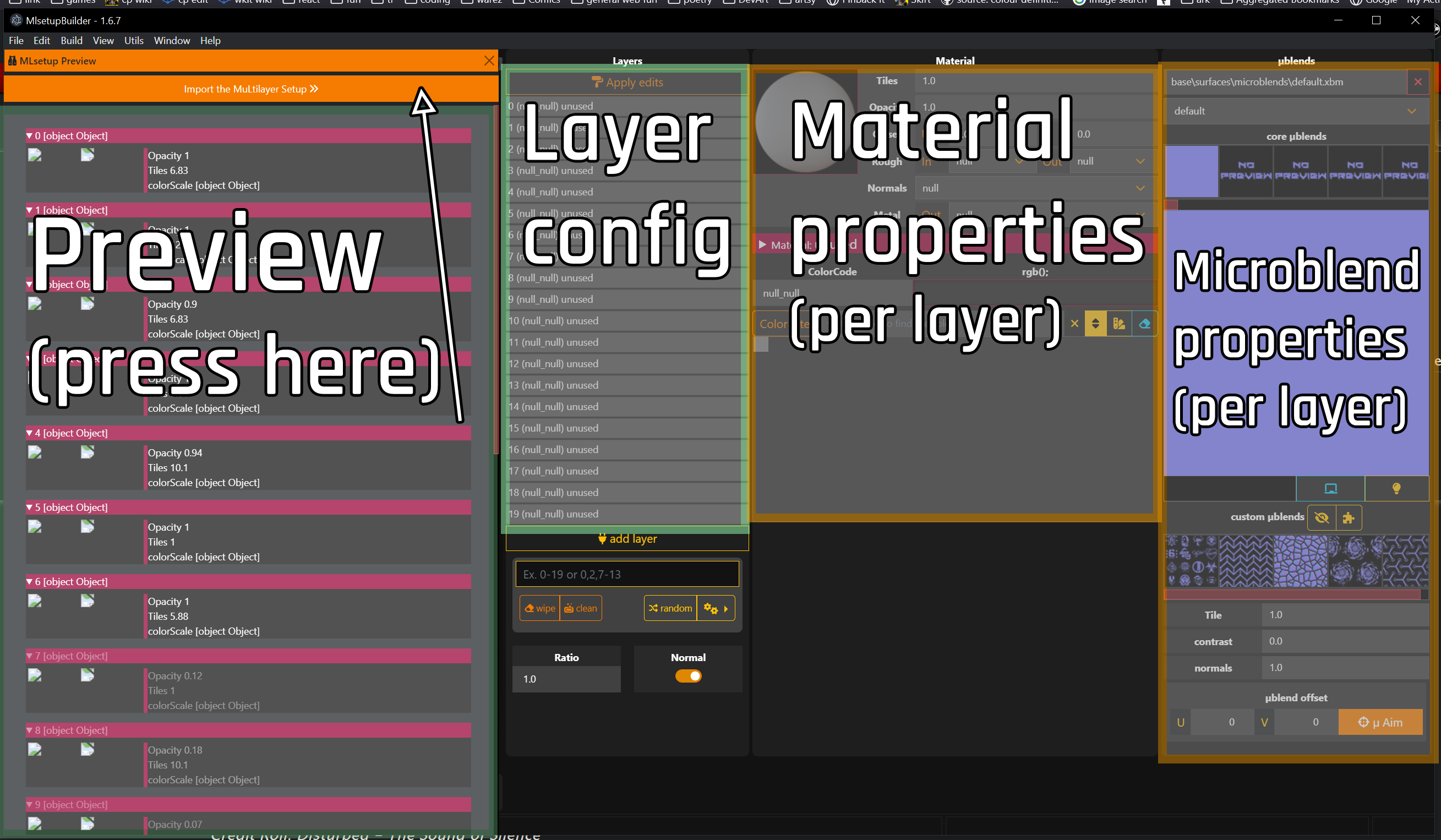 The preview was hiding an empty 3d viewport. To [use that](#about-that-3d-viewport), you will need to [configure](#configuration) MLSB first, but you can already click through the individual layers and assign [material properties](https://github.com/CDPR-Modding-Documentation/Cyberpunk-Modding-Docs/blob/main/for-mod-creators-theory/modding-tools/mlsetup-builder/broken-reference/README.md) (such as roughness, normal strength, base material and colour) from the "Material Properties" panel.