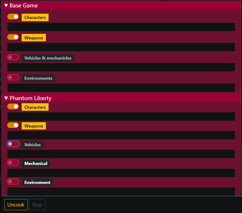 * Uncook folder / Depot is the folder you have configured in [Wolvenkit's Settings](https://app.gitbook.com/s/-MP_ozZVx2gRZUPXkd4r/wolvenkit-app/settings#depot-path)