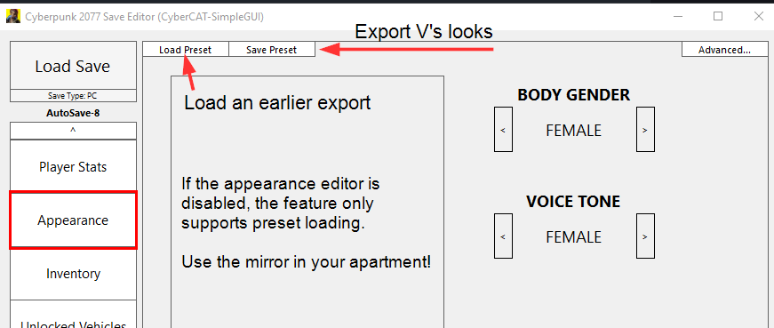 After loading a save, you can export V's appearance as a preset from the **Appearance** tab. This will create a `v2preset` file, which you can import via `Load Preset`.